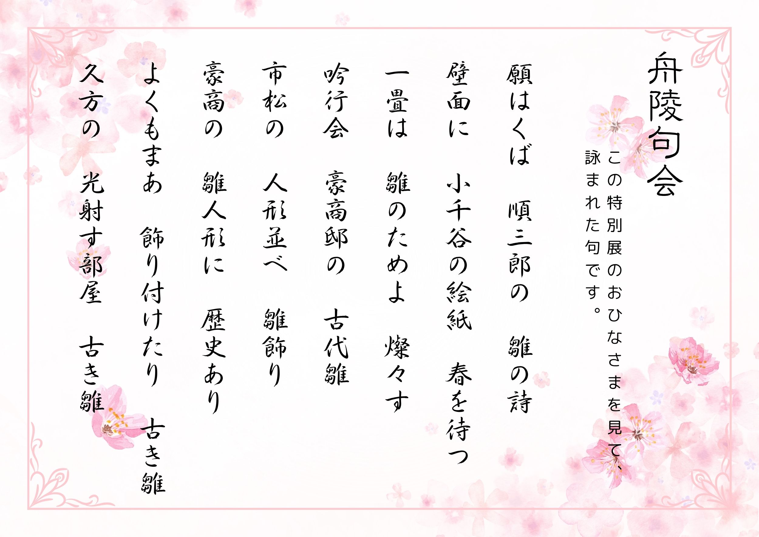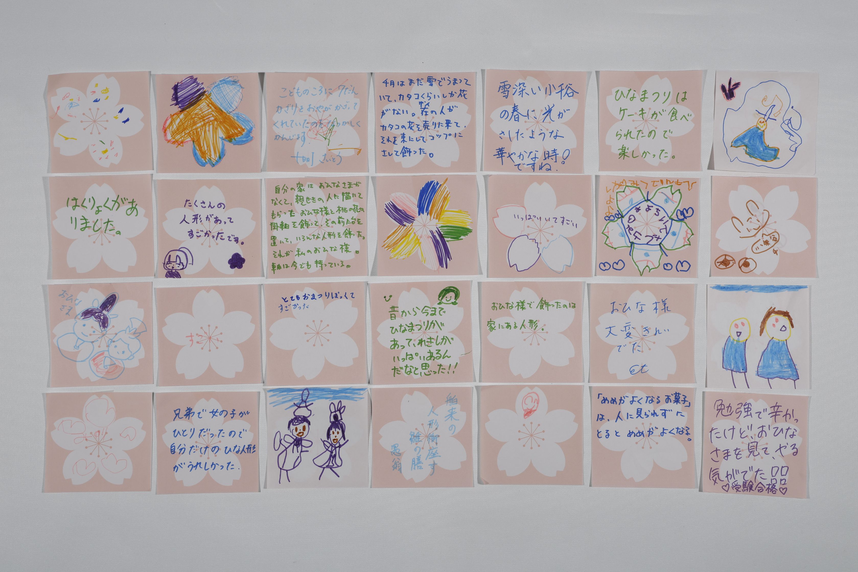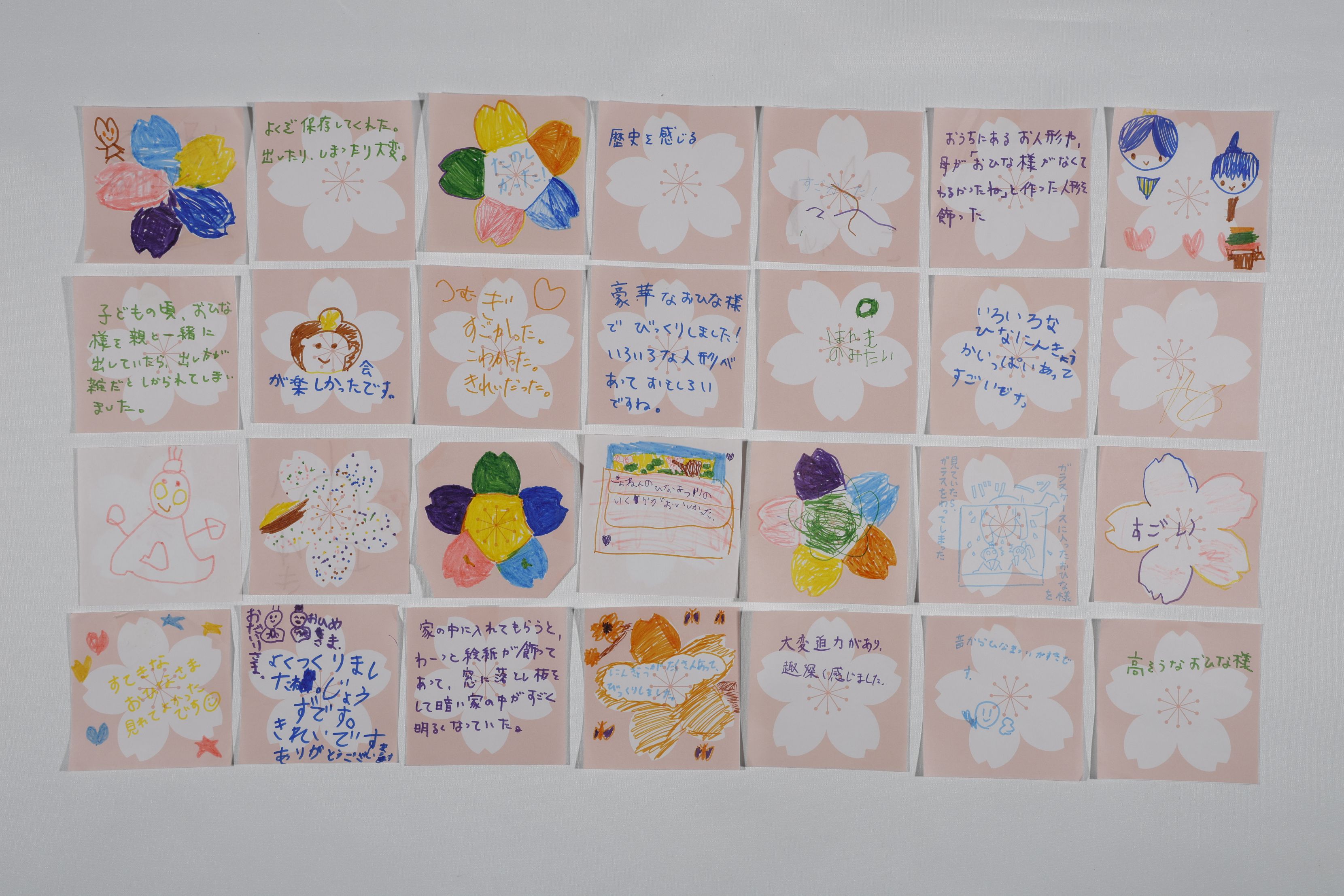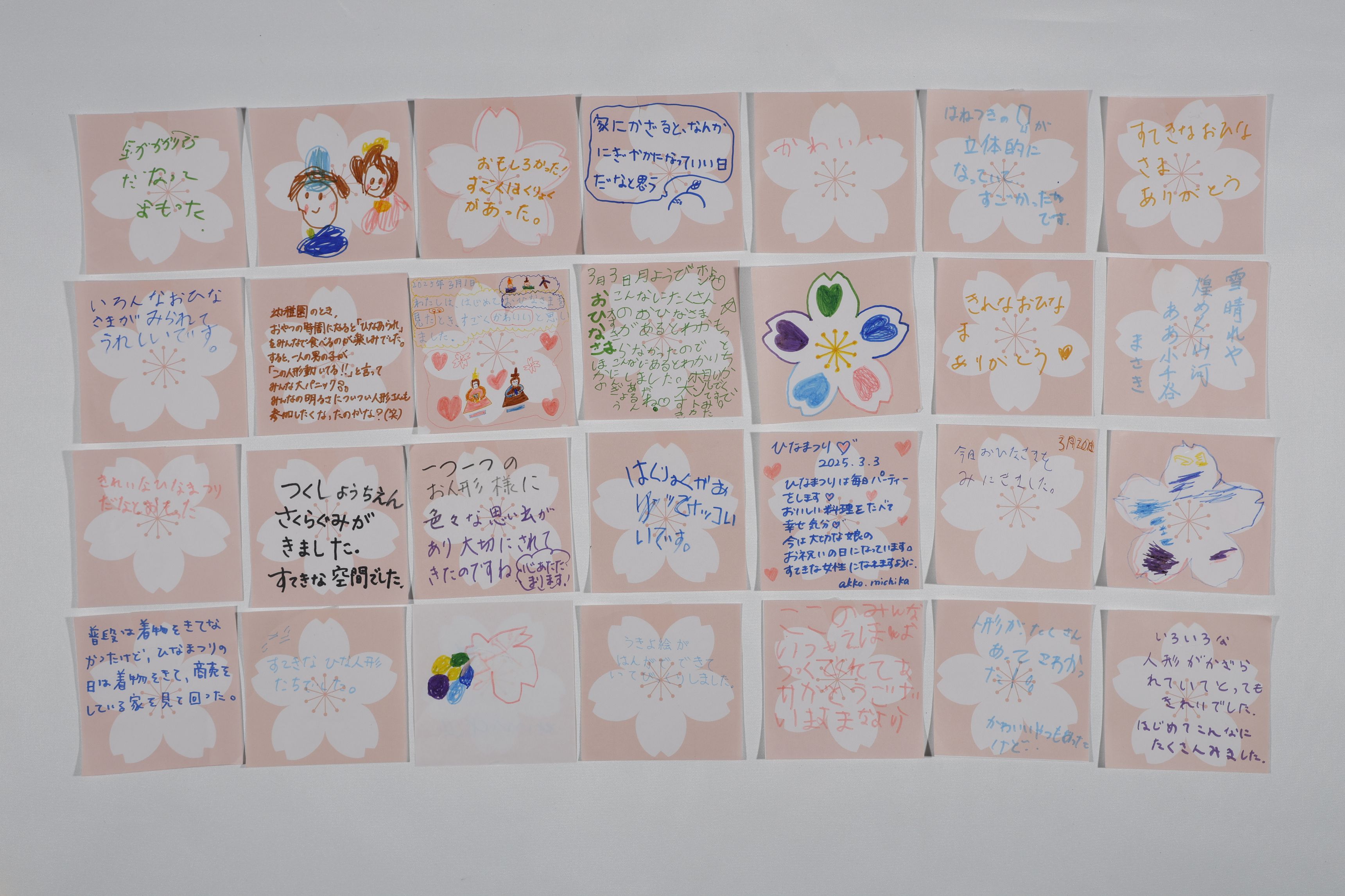 みんなでさくらのはなをさかせましょう あーかいぶ 2025 とうきとくべつてん2025年2月22日~4月6日まで、小千谷市郷土資料館(ホントカ。内)にて開催された【有形民俗文化財指定記念特別展】「小千谷のひなまつり~道具から見る小千谷の交流・自治・利他~」にて、来館者の方からひなまつりの思い出や、展示を見ての感想などを「桜の花」の用紙に書いてもらいました。 会期中たくさんの方のご協力のおかげで、『おもいでの木』に桜の花が咲き誇りました。
