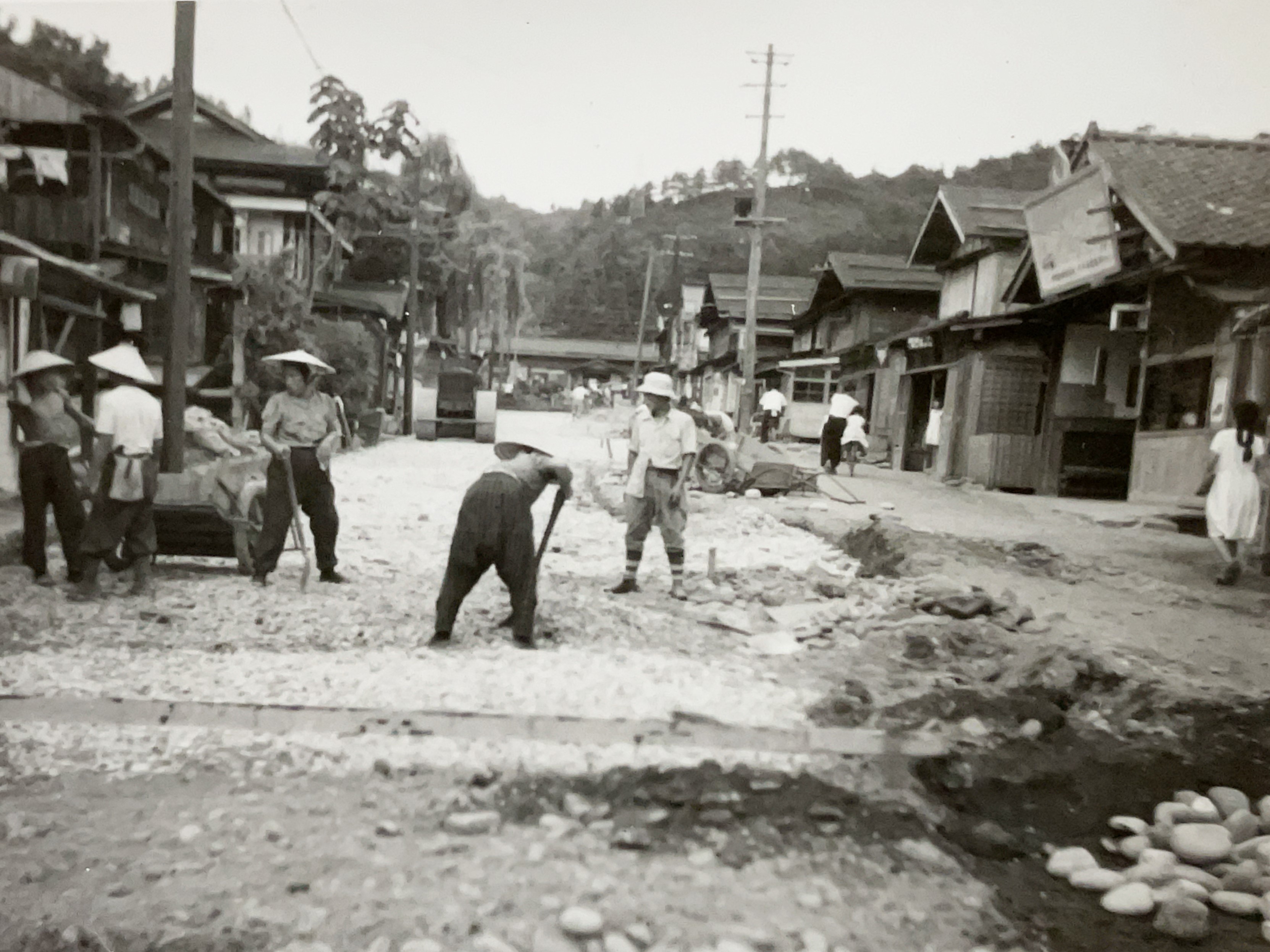 小千谷駅前の道普請、路床・路盤を人力で一生懸命敷き詰めている様子をおさめた一枚である。現代であれば、ダンプカーで砂利を運び、バックホーで敷きならし、ロードローラーで転圧を行うものである。写真の中には、リアカー、スコップ、丸太・蛸が見られる。この中でも特に苦労する作業が、リアカーによる石の運搬であろう。小千谷駅前の通りは自動車に乗るとほとんど気がつかないが、信濃川に向かって長い傾斜が続いている。当時石のほとんどは信濃川河床にて採集しなければならないだろう。リアカーの周りで談笑している様子は、決して仕事の手を抜いているのではなく、600mの長坂にて一生懸命大量の丸石をリアカーで積み上げた人々の安堵、と見ることでより一層感慨深いものがある。駅前という大街道であっても、一人ひとりの人間の苦労によって造られ、現在でもその道が使われ続けていることに驚きと感謝がたえない。