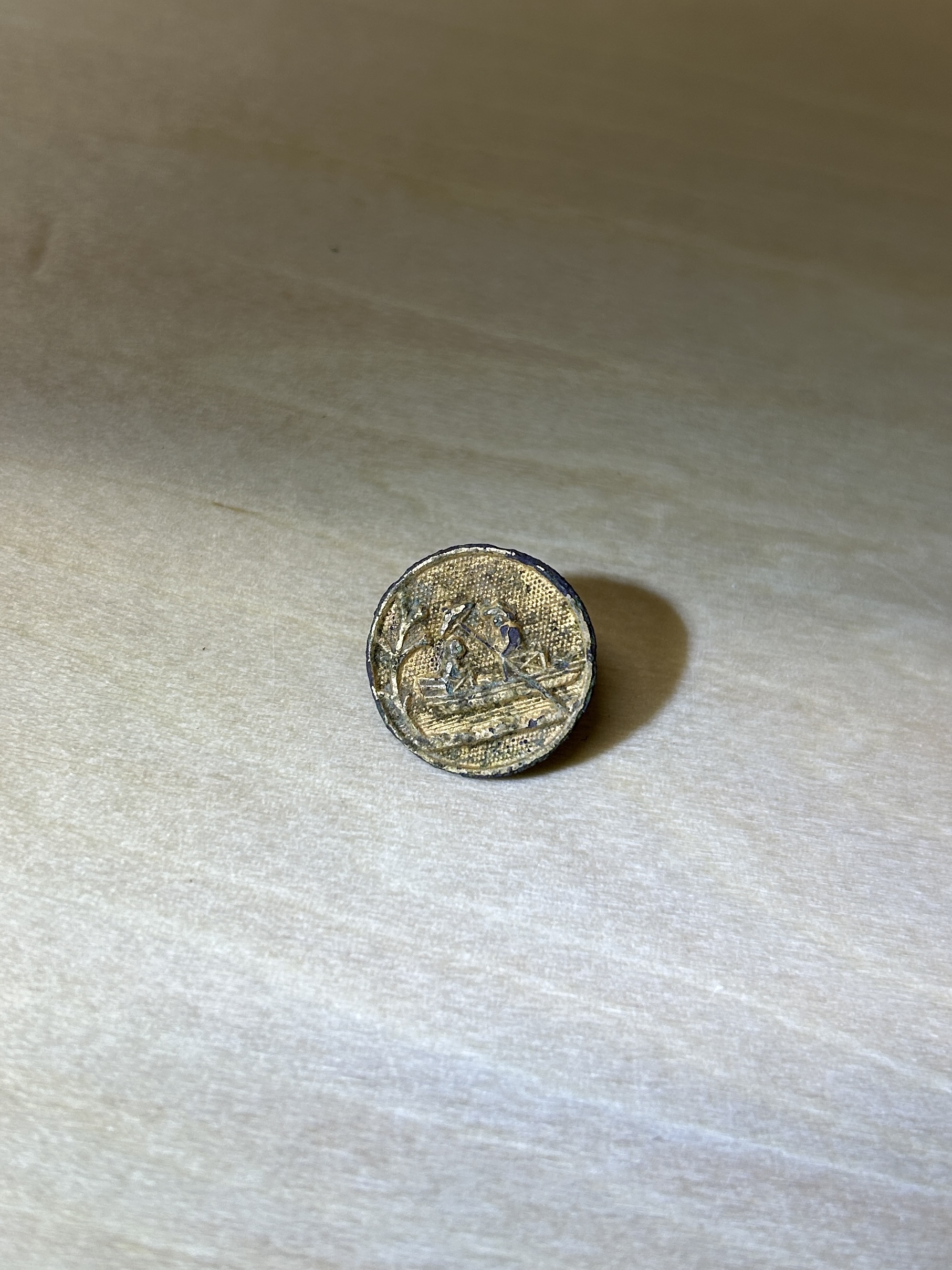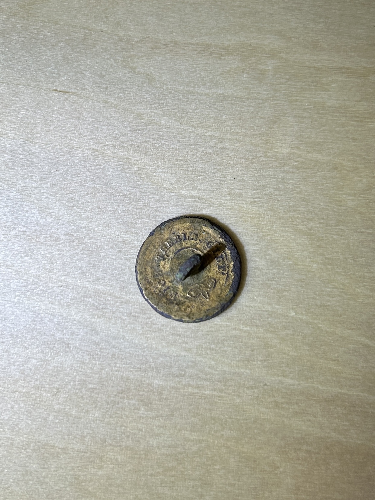 Google画像検索により、「Worth Point」(アンティーク・美術品・収集品を扱うオンラインデータベース)のサイト上に、同様の模様のボタン画像を発見した。 そのボタンには「T.W&W」の文字があり、1845年設立のフランスのボタン製造会社「Trelon Weldon Weil」のものと考えられる。この会社はアメリカ南北戦争時に両軍へボタンを供給していた。