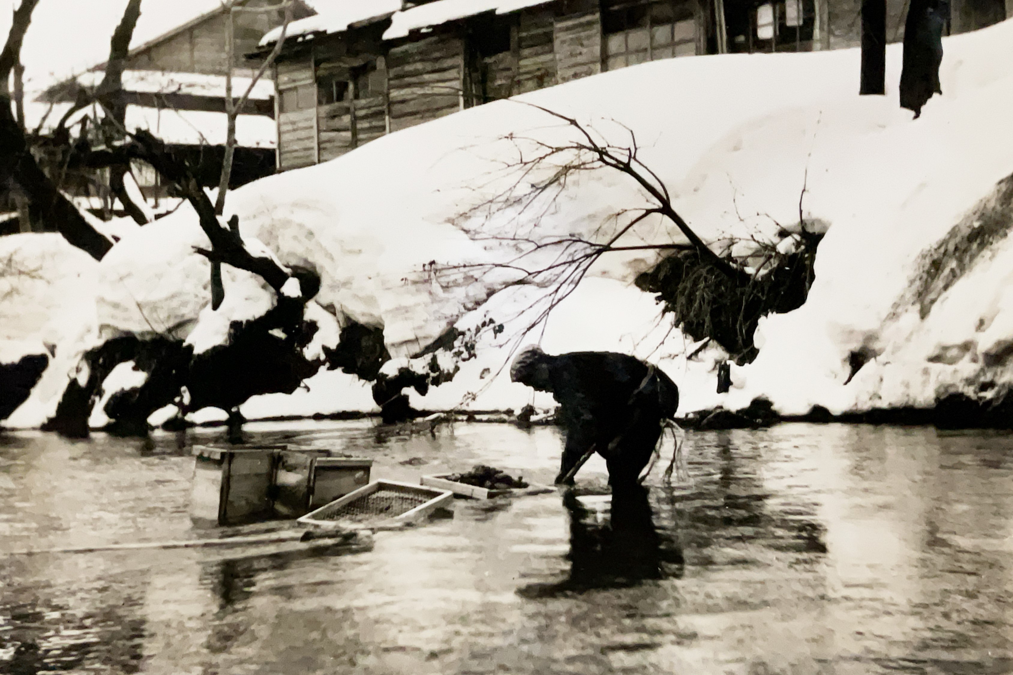 小千谷における伝統的な漁労の様子をとらえた貴重な一枚である。小千谷における最も古い漁労の様子を示す資料は、三仏生や元中子にて約五千年前の縄文時代の遺跡で見つかる。網を川床に設置し、流れないように端を石で留め、魚を追い込み捕まえる、という方法である。魚を効率的に捕まえるために、大量の「網」と「石錘」が必要となる。昭和の事例を眺め比べると、なるほど縄文時代とそれぼど技術は変わらないようである。縄文時代から続く人も魚もお互い生存するための熾烈な知恵比べ。それは時代を超え夏でも冬でも変わらない。