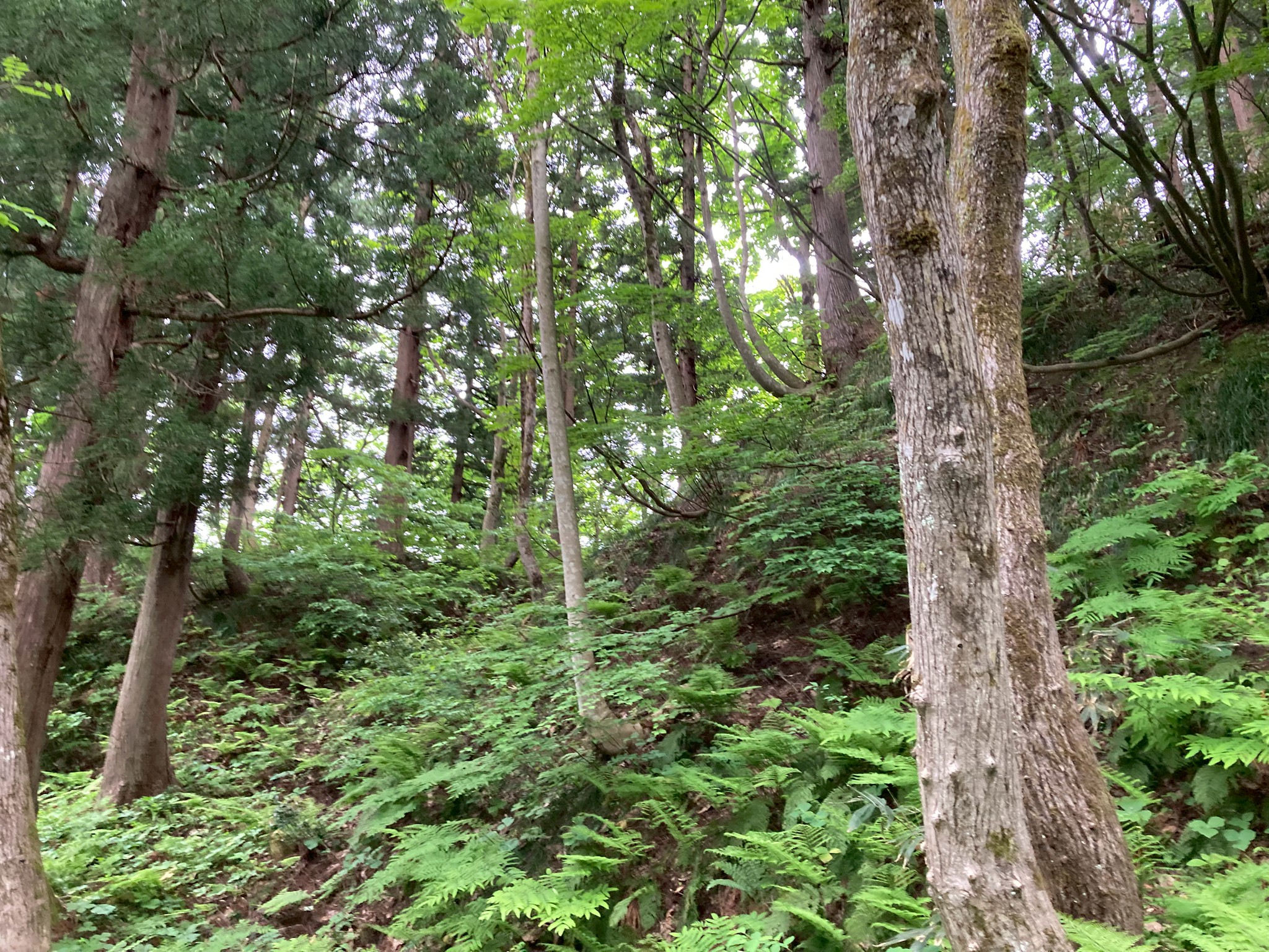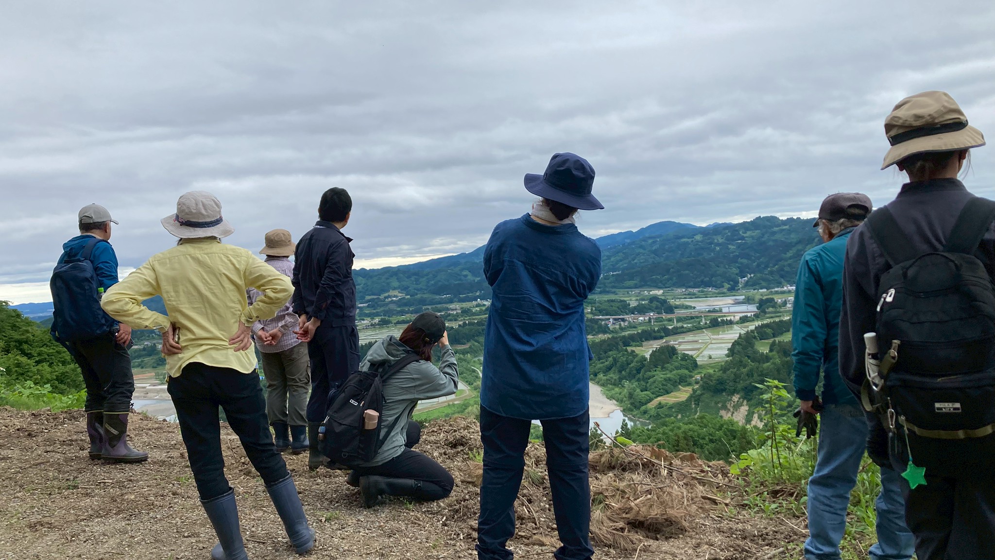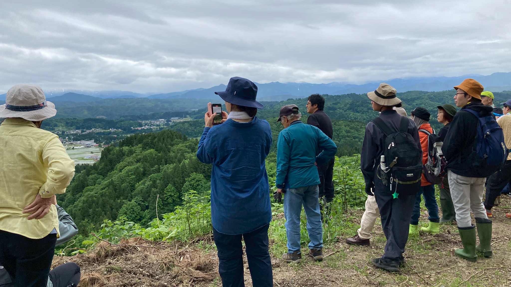 【高場山の役割】 御館の乱では周りが敵だらけになったので全方向に守りを固める必要がありました。そのため、遠くを見渡せるこの高場山はとても重要だったそうです。唯一、岩沢の方は山があって津南側が死角になるので、その山には函山城という城を築き、信頼できる田中氏の家来に見張らせていました。そうすることで周りの動きを把握できたそうです。 当時は弥彦山からこの山までは移動に五日ほどかかったので、弥彦山で何か動きが見えたらその間に準備ができました。 【高場山からの景色】 内ヶ巻城の搦手から車に戻り、また道を進んでいきました。やがて木に囲まれていた山道から一変、開けて見晴らしの良い場所に辿り着きました。目の前の斜面下の方にはクサソテツやクズなどの植物が生い茂っていて、木は生えていなかったので、遮るものもなく遠くまで見渡せて気持ちの良い場所でした。 見張り台はもう少し上にあるそうですが、そこまでいくと新潟平野のほぼ全てを見通すことができ、条件が良ければ朱鷺メッセも見えるそうです。 景色を見ながら、みんなであれは薭生城であれがあそこが川口で〜と指を刺しながら確認し合いました。山本山はこの山が陰になるので見えないとのことでした。 ポツリポツリと雨が降り始めていました。ここで記念撮影。なんと、講座が始まってから初めての記念撮影でした。