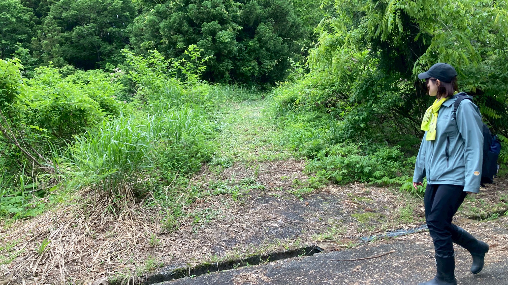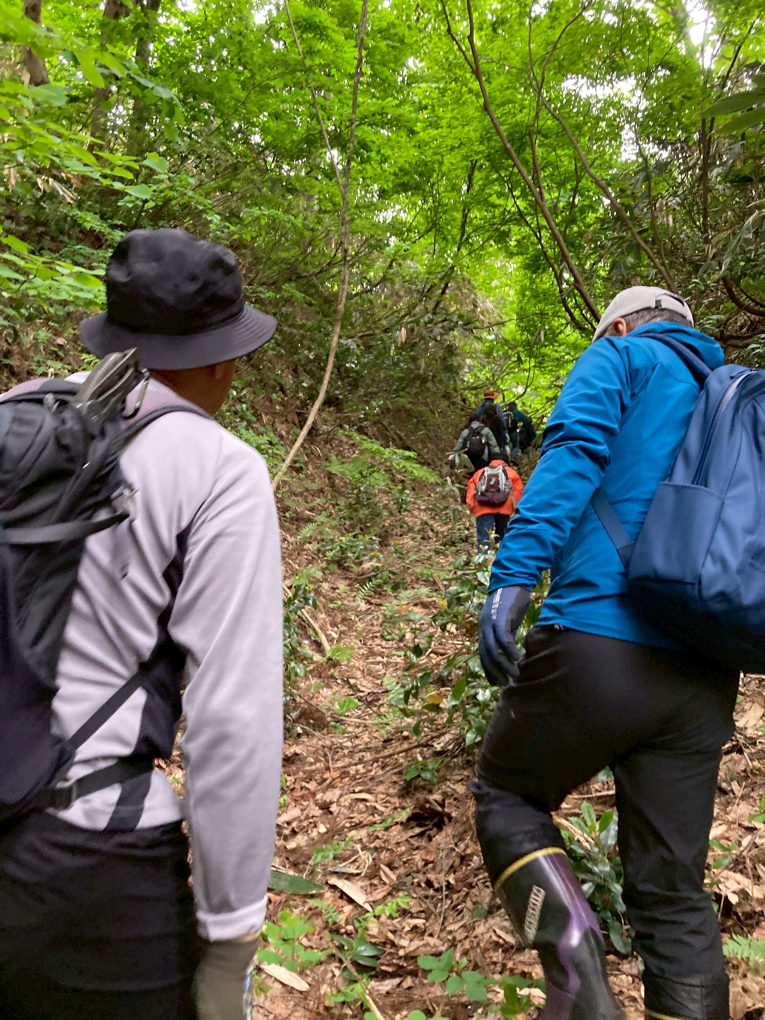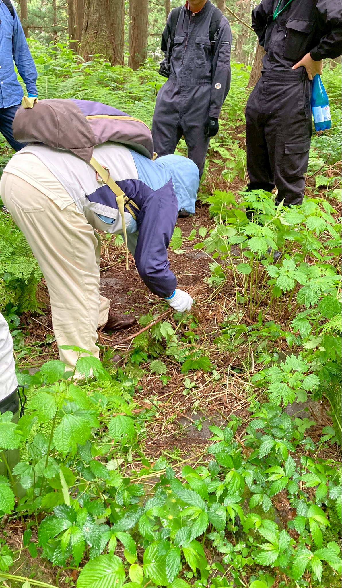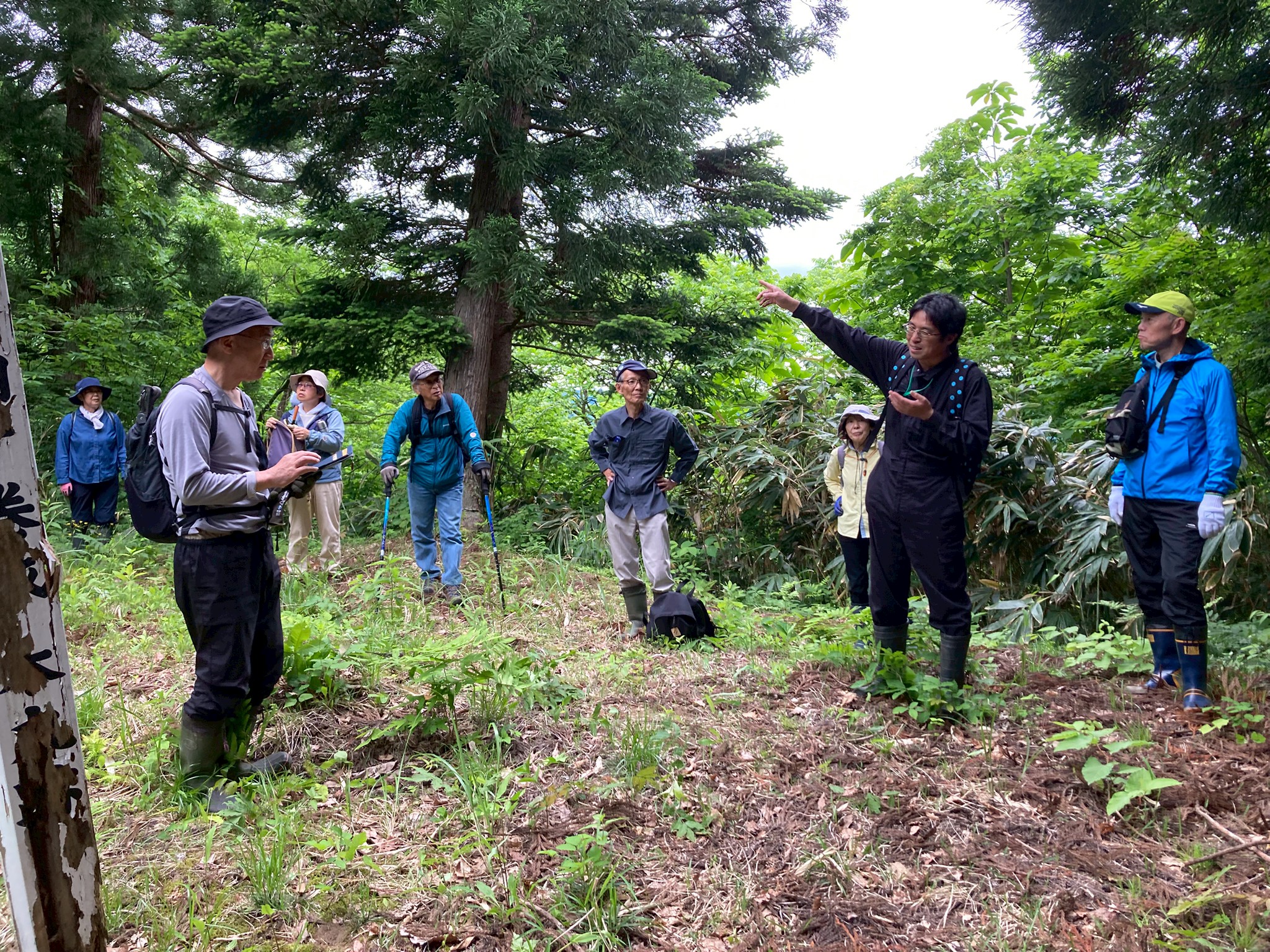 【高場山の役割】 御館の乱では周りが敵だらけになったので全方向に守りを固める必要がありました。そのため、遠くを見渡せるこの高場山はとても重要だったそうです。唯一、岩沢の方は山があって津南側が死角になるので、その山には函山城という城を築き、信頼できる田中氏の家来に見張らせていました。そうすることで周りの動きを把握できたそうです。 当時は弥彦山からこの山までは移動に五日ほどかかったので、弥彦山で何か動きが見えたらその間に準備ができました。 【高場山からの景色】 内ヶ巻城の搦手から車に戻り、また道を進んでいきました。やがて木に囲まれていた山道から一変、開けて見晴らしの良い場所に辿り着きました。目の前の斜面下の方にはクサソテツやクズなどの植物が生い茂っていて、木は生えていなかったので、遮るものもなく遠くまで見渡せて気持ちの良い場所でした。 見張り台はもう少し上にあるそうですが、そこまでいくと新潟平野のほぼ全てを見通すことができ、条件が良ければ朱鷺メッセも見えるそうです。 景色を見ながら、みんなであれは薭生城であれがあそこが川口で〜と指を刺しながら確認し合いました。山本山はこの山が陰になるので見えないとのことでした。 ポツリポツリと雨が降り始めていました。ここで記念撮影。なんと、講座が始まってから初めての記念撮影でした。