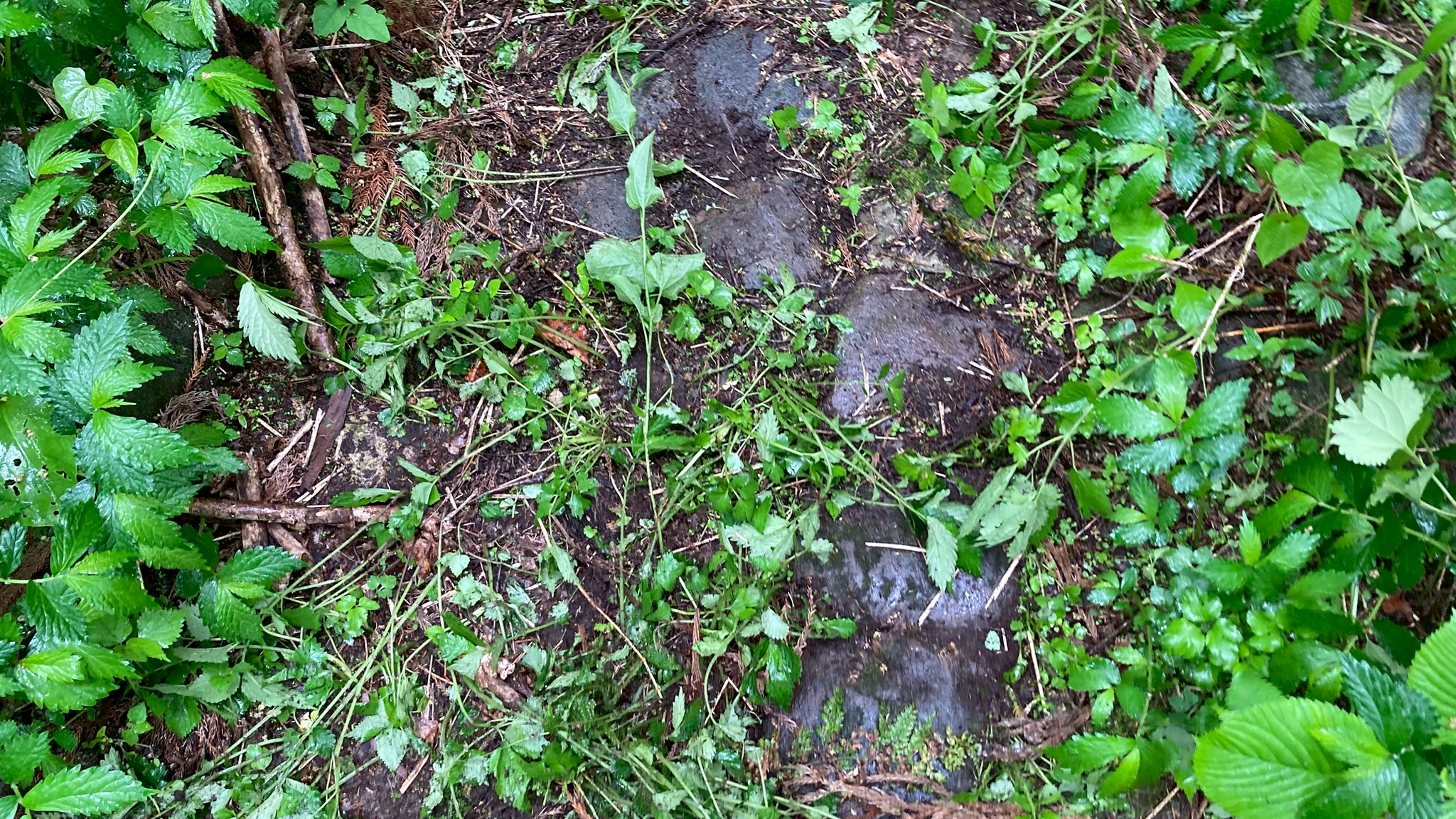 【本堂?】 櫓や池を見てまわり、最初の石垣のところへ戻ってきました。低くなっているところから石垣の奥へ登ってみると平な草むらでした。 足元は石畳になっているとのこと。 でも草ばかりでどこら辺にあるのかな?と思っていたら、大橋さんがどんどん草を抜いていき石畳が広範囲に敷き詰められているということがわかりました。 その奥にはまた石垣があり、そこを上がると地面に雨落ち溝がありました。 歩いてみると、最初の場所から、石垣、石畳、石垣、雨落ち溝(建物)というような構造になっていました。 雨落ち溝の広さを考えるとそこには大きな建物があったとわかりました。記録によると三階建ての建物だったそうです。絵図や設計図は残っているそうなので、石畳の謎の穴やあたりに置いてあるさまざまな石などが何に使われていたのか照らし合わせてみるとわかるかもしれません。 だんだん当時のお寺の姿が想像できて面白くなってきます。全部出せたら壮観だろうと思いました。 帰る途中雨に気を取られ転びました。石に躓いたようで、大きな丸い石でした。大事な遺物にぶつかってしまったのでドキドキしました。石は傷ついていないようでした。よかった…。周りを見ると同じような石がいくつも転がっていました。なんの石だったんでしょうか。他にも四角に積み上がった石、石垣に使われるより大きめの石なども見つけられ、いろいろな形の石が使われたことがわかりました。それぞれの用途やどんな意味があるのか知りたくなりました。 土や草を全部退けた姿を見てみたい。綺麗にするかもという話も聞いたので楽しみです。