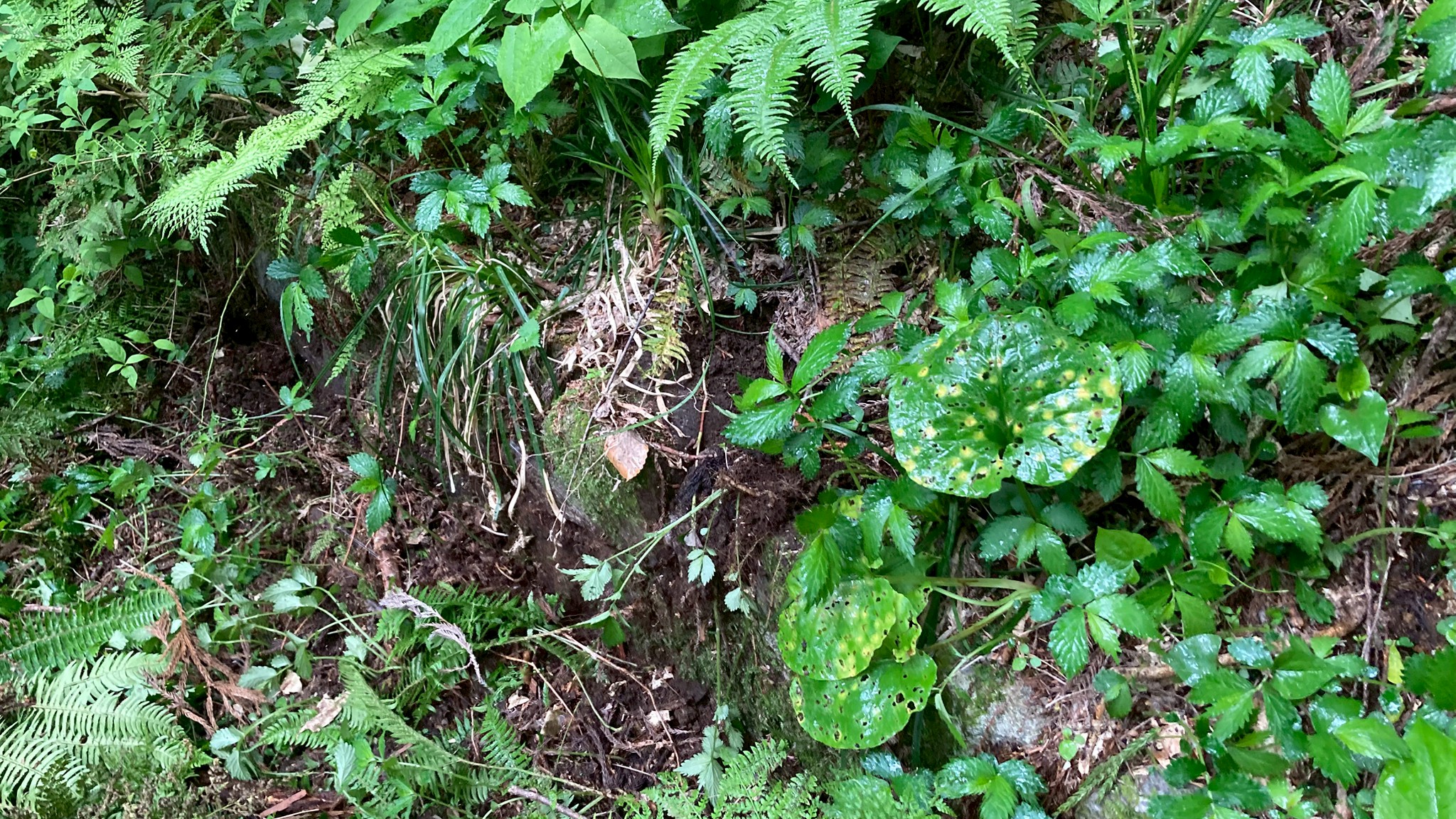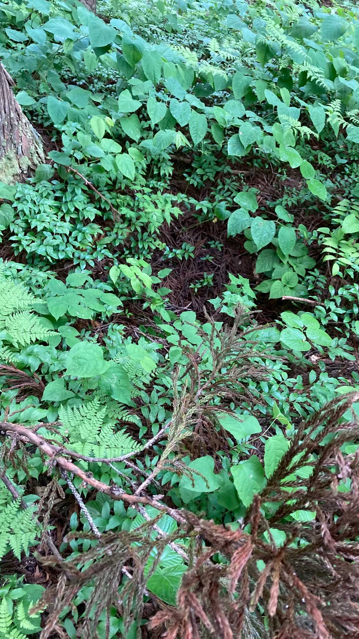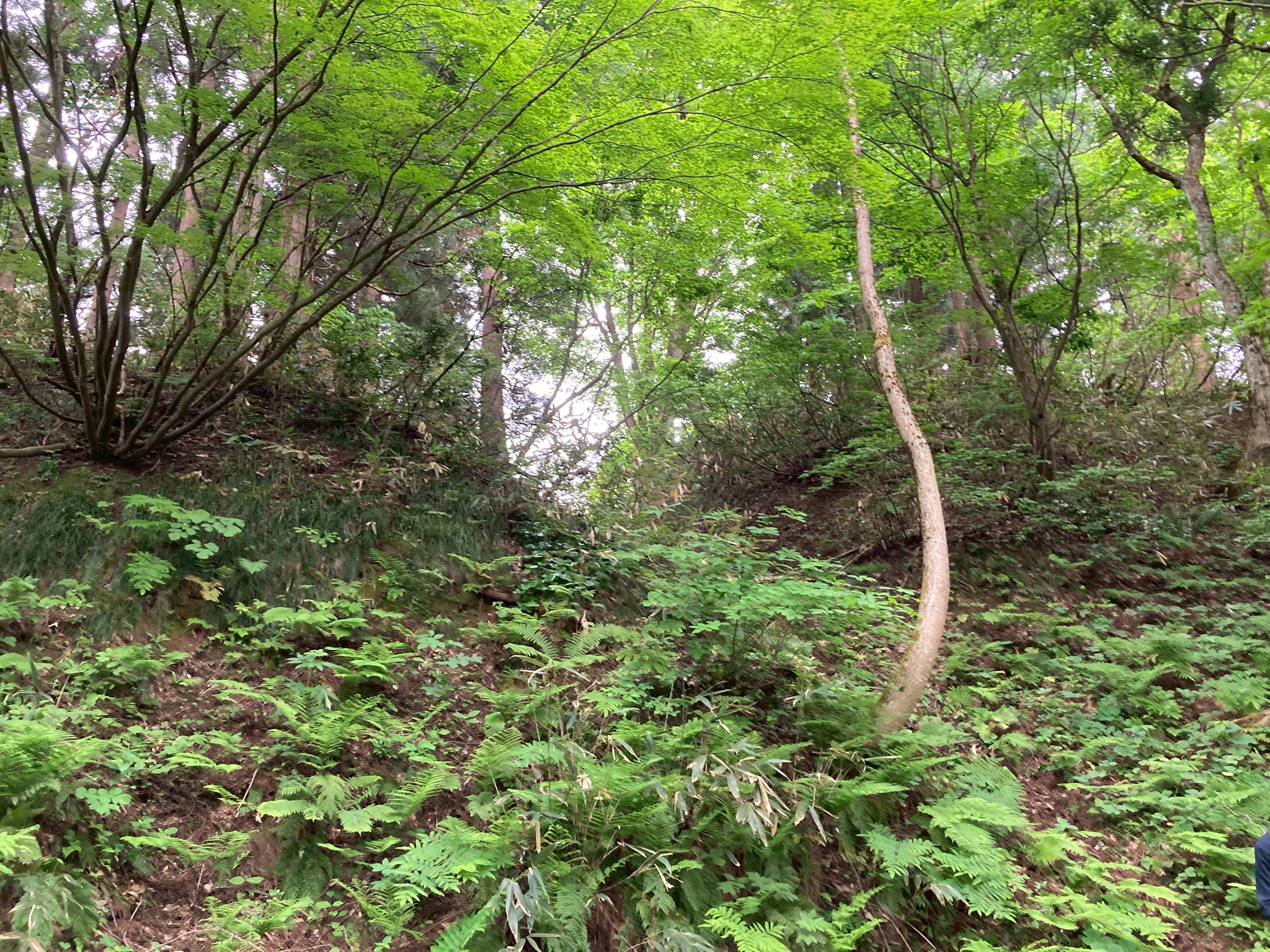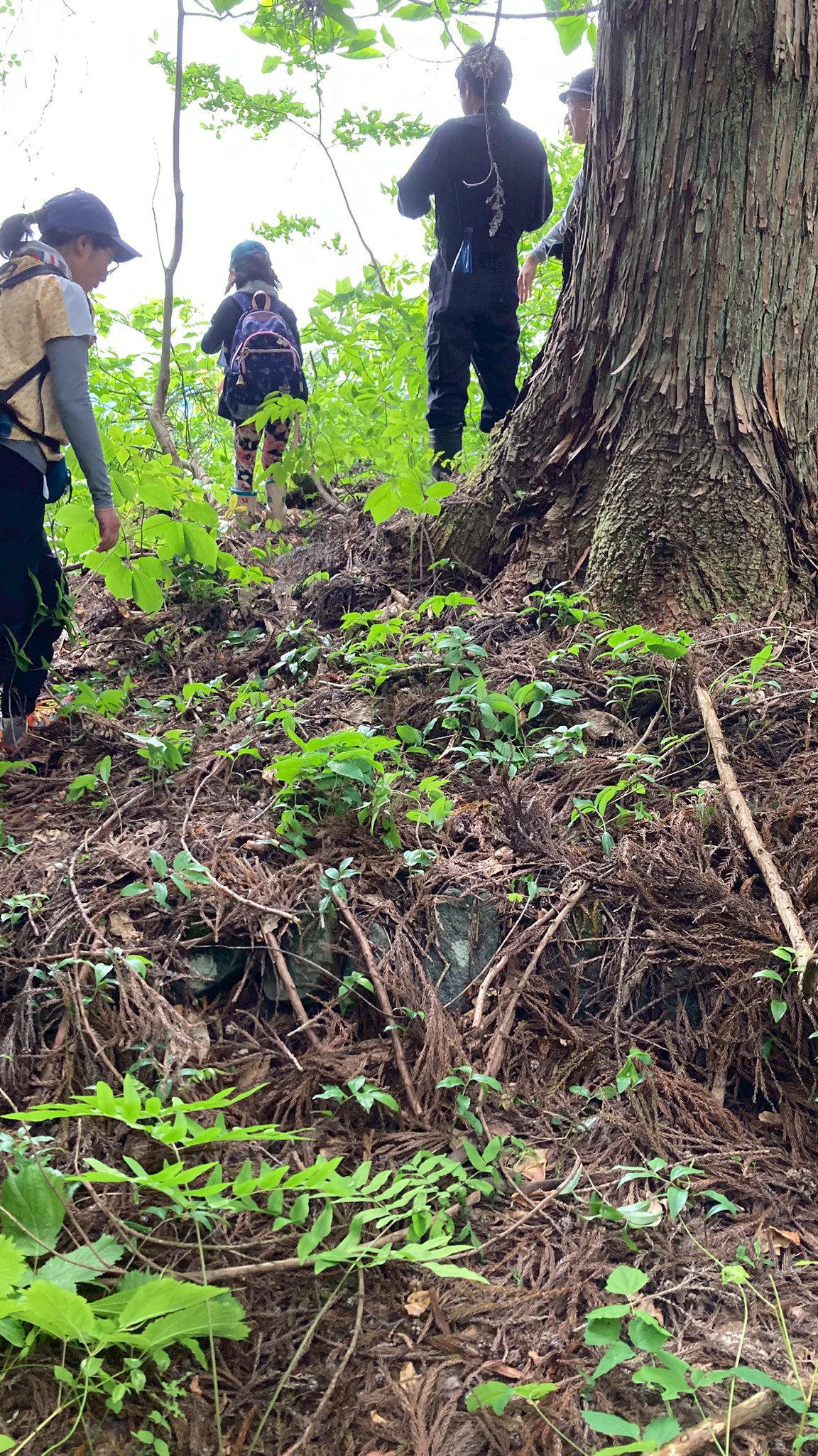 【搦手(からめて)】 今回は城の入り口から入らず、そこから車でもう少し上がったところにある搦手という裏口からお城に入りました。居館に水や食料を運ぶ為の道で、地主さん?が事前に木を切ってくれていて歩きやすくなっていました。緩やかな傾斜のその道は杉の葉と大きな枝がたくさん積もっていて足を取られ何度も躓きました。 【郭(くるわ)】 さらに進むとちょっとひらけた場所に出ました。草や木が生い茂っていて分かりづらかったのですが、郭と崖側に土塁を見ることができました。土や草木で見えないけれど井戸やかまどの跡があるかもしれないとのこと。 この場所は至る所にマムシグサが生えていました。 郭と居館の話が難しかったです。居館は住むための場所ということですが、郭の中にあったということ?居館は建物を建てる場所のこと?それとも建物自体を指すのでしょうか。山城には建物がなかったという話も聞きましたが、その場合どこで寝ていたのでしょうか。一部盛り上がった場所があってそこにも意味があるけどそれが何かはわかっていないということに心にくるものがありました。 【山城の探し方】 山に登った時に土塁や平坦部、謎の窪み、素掘りの井戸、不自然な盛り上がりなどが見られると山城かも?ということでした。 その話を聞いて、今は郭や土塁をそれとわかった状態で聞いているから、なるほどと思うけれど、一人で山に行ってそれらしいものを見つけても、山城の跡か、別のものか、慣れていないと判断は難しそうだなと思いました。 【当時食べていたもの】 当時は玄米とか粟、稗を食べていたらしいです。戦が始まると食べるものがなくなってくるので、煎餅状にしたものや乾飯などの保存食を戻して食べていました。 当時の味はどんなものだったのか。他にも山に生えている植物も食べていたのでしょうか。山で見かけたマムシグサには救荒植物として利用されていた歴史があるそうです。もし現在山に生えている植物の中に、当時から生えていたものがあったとしたら、食べられていたかも知れないと思いました。