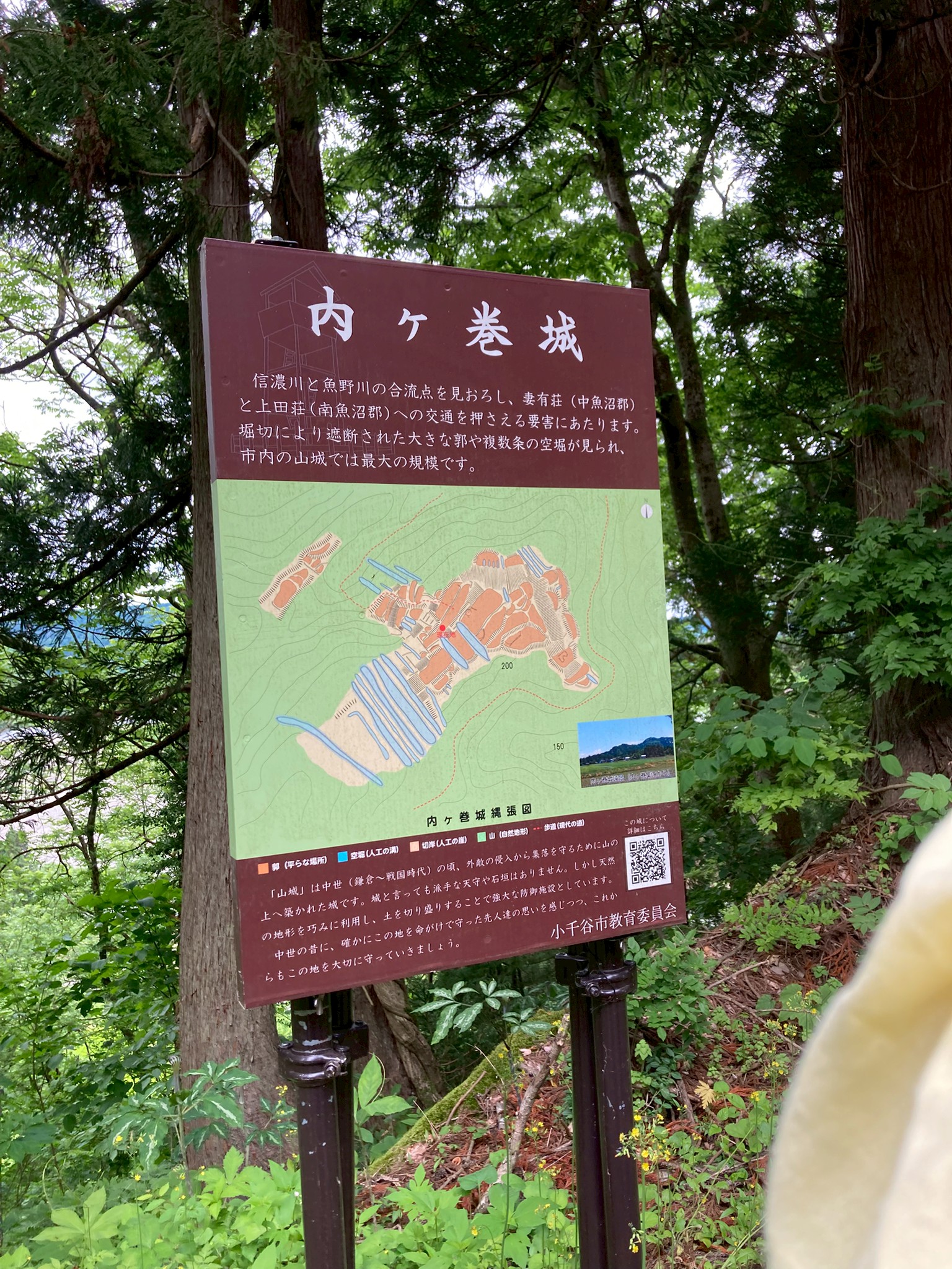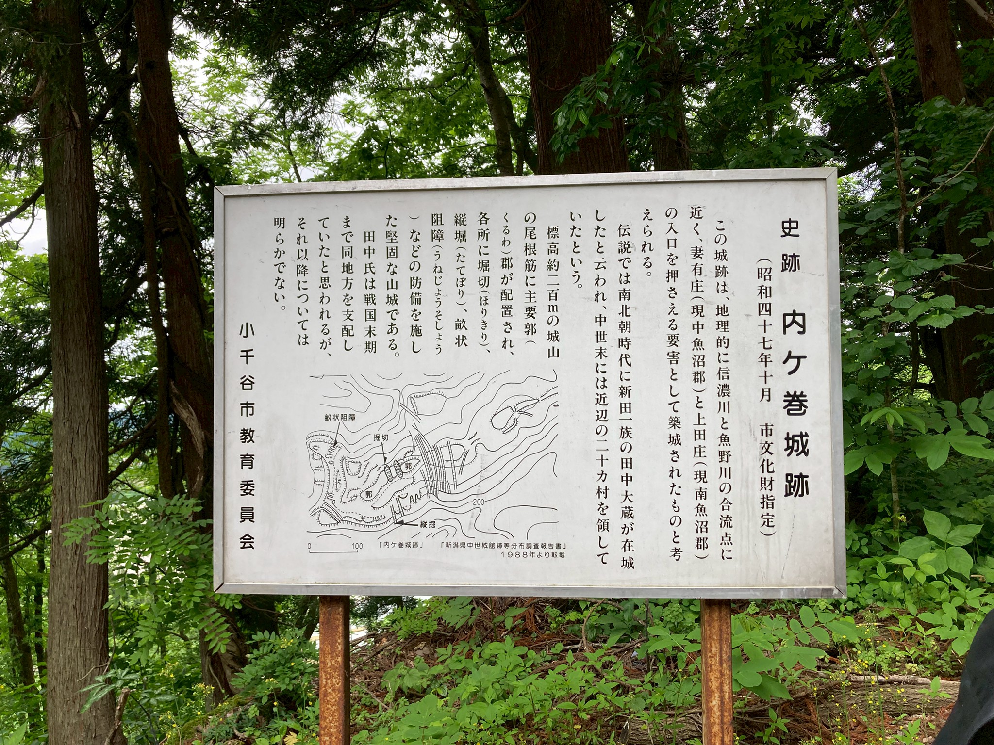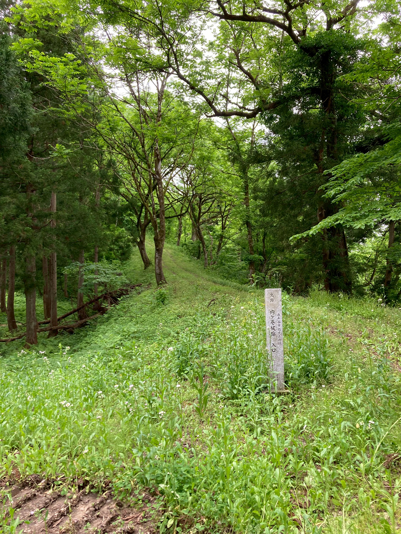 【内ヶ巻城の歴史】 内ヶ巻城は県内で3番目に大きい山城で700年前南北朝時代の田中氏が300年営んでいた山城。北条氏の城を真似て作ってあり、標高が200mと低めな分、防備に力を入れて守りを固めていました。 三国峠の末端に位置しているこの内ヶ巻城は、御館の乱では上杉景虎とその後ろについている北条家の勢力を抑えるのに重要な場所だったとのこと。田中氏は景勝に言われてこの土地を死ぬ気で守ったそうです。 【道中での学び】 集合場所の妙高寺の駐車場から、何台かの車に分乗して内ヶ巻町内に向かい、そこから山に入りました。山の道中は細い砂利道で、上から落ちてきた岩が転がっていました。 内ヶ巻城に着くまでに、去年まで田んぼだったところが養鯉池になっているという話や落石注意とは落ちてくる石に注意するのではなく、落ちている石に注意するのだという話を聞き、道中からも学ぶことがありました。 【内ヶ巻城入り口】 駐車場はないので、道の途中に車を停めて見学しました。入り口と書かれた目印の先は長い道が森の奥に続いていました。近くに看板が立っていて、内ヶ巻城について書いてありました。当初、看板を立てる予定だったところまで持っていけなかったそうで、看板に書かれた現在地は現在地じゃないというややこしいことになっていました。 入り口の隣右には階段城になった土塁?があり、左にはちょっと降りたところに平坦な場所がありました。工事の際の駐車場?資材置き場?それとも山城に関係のあるもの?何か意味があるのかなと思いました。