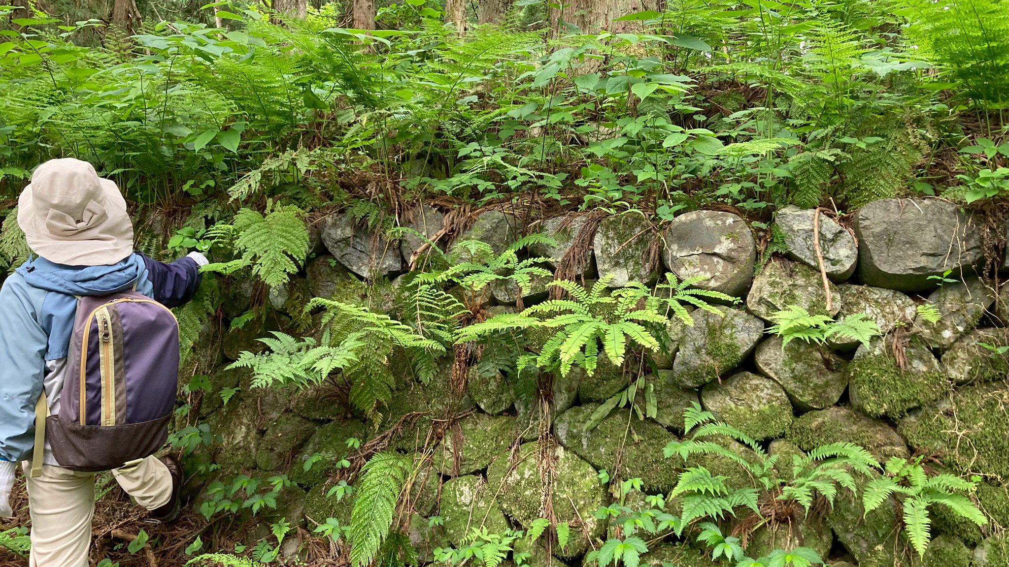 【戦国時代のお寺】 戦国時代、お寺は力を持っていました。 防衛設備である山を持っていたこと、山をよく歩くので健康な人が多く、山伏や僧兵になりやすかったことから、お寺の勢力は武士より強かったのだそうです。 【妙高寺】 妙高寺跡には常に戦いに備えていた跡が残っていました。今は山の麓にある妙高寺ですが、大正時代までは今の場所から80mくらい上がった山の中にありました。1300年代の南北朝時代、群馬から田中氏と一緒にきた曹洞宗の僧侶が土着してお寺が建てられて、1900年代に火事で燃えるまで600年間住み続けていました。そうして内ヶ巻城や高場山周辺を管理していました。 池ヶ原、芋坂、塩殿は田中さんが作ったと言われている村で、妙高寺の檀家さんがいる場所と分布がほぼ同じだそうです。 【お寺の戦い方】 お寺には普段から人が住んでいるので、石や丸太の他にも戦いで使った武器には種類がありました。一番嫌がられたのは肥溜め。煮立ったお湯や油も使ったといいます。 私はお寺は戦に参加しないと勝手に思っていたので、この話を聞いて驚きました。丸太や石も怖いはずなのに、見慣れているものの方が想像できて、何倍も嫌だなと思いました。その後の後片付けはどのようにしたのでしょうか。油などの液体も掃除が大変そうです。 【妙高寺跡石垣】 天候も相まって、薄暗い林の中を歩いていくと、草に覆われている石垣が見えてきました。 石垣の高さは150cmくらい?石は正面が綺麗に割られて積まれていました。ここにかつて妙高寺が建っていたと聞き、立派なお寺だったんだろうなと思いました。使われた石はこの山にはないので、信濃川からもってきたかもしれないこと、戦国時代から石垣があるかはわからないけれど、この積み方は江戸時代中頃のもので石をうちかえて積んであるとのことでした。 この場所は普段住むための場所としても使われていた郭で、後ろから攻められないように周りは切岸で囲われていました。 高いところへ敵の兵は登っていくので、守るための城はここから始まっているといっても過言ではないとのこと。上の林道にも池や階段状の段差など、内ヶ巻城でも見られたようなものを見ることができるそうです。 山の中に立派な石垣が見えてびっくりしました。どうやってあんなに綺麗に割ったんだろう。何かコツがあるのでしょうか。講座の石器作りを思い出しました。