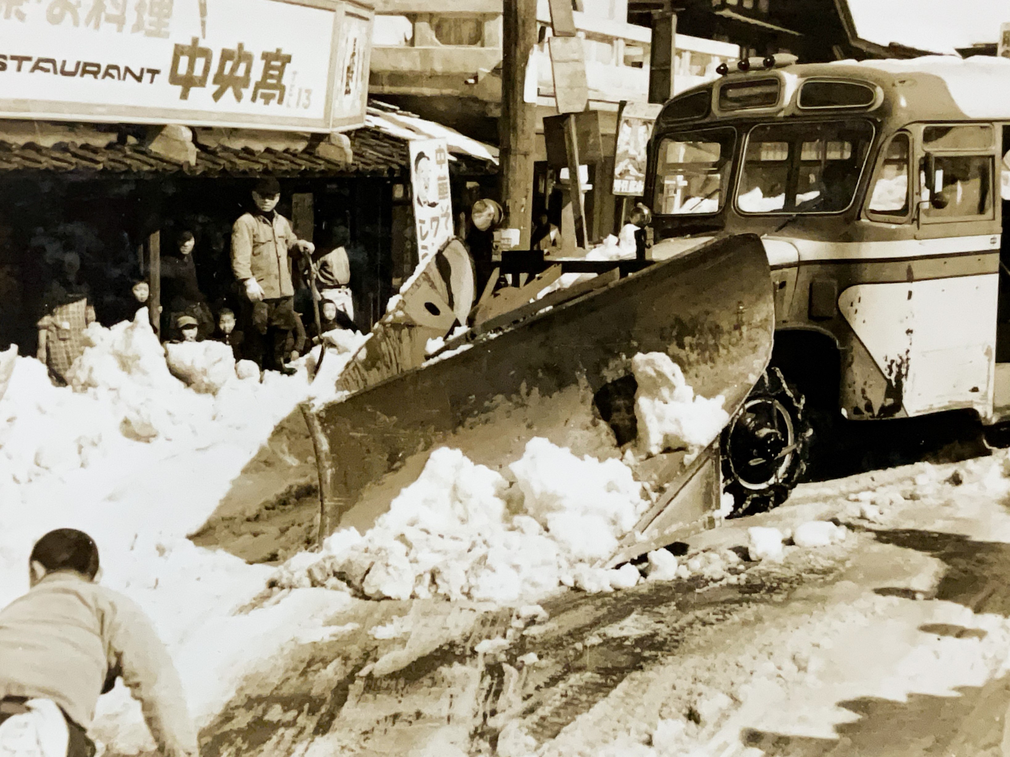 「プラウ」とは、除雪車に付属させ、雪を押しどかす雪国には欠かせない道具である。当時まだ馬力の高いブルドーザーなど重機は普及していなかったため、馬力の高い車両を一時的に代用していた。この時は、1950年代に生産されたトヨタ製のボンネットバスFB型、105馬力を誇る巨体で、その荷を全て下ろし、どんどん雪を押し運んでいる。普段は、学生・労働者など様々な人々を運ぶ穏やかなバスであるが、さも頼もしい雪国の英雄に見えたに違いない。ただ今のブルドーザーのように、プラウの上下の動きは苦手だったようで、道路面をかなり傷つけており、春先に改めて行う舗装で苦労したということは、また別の話。