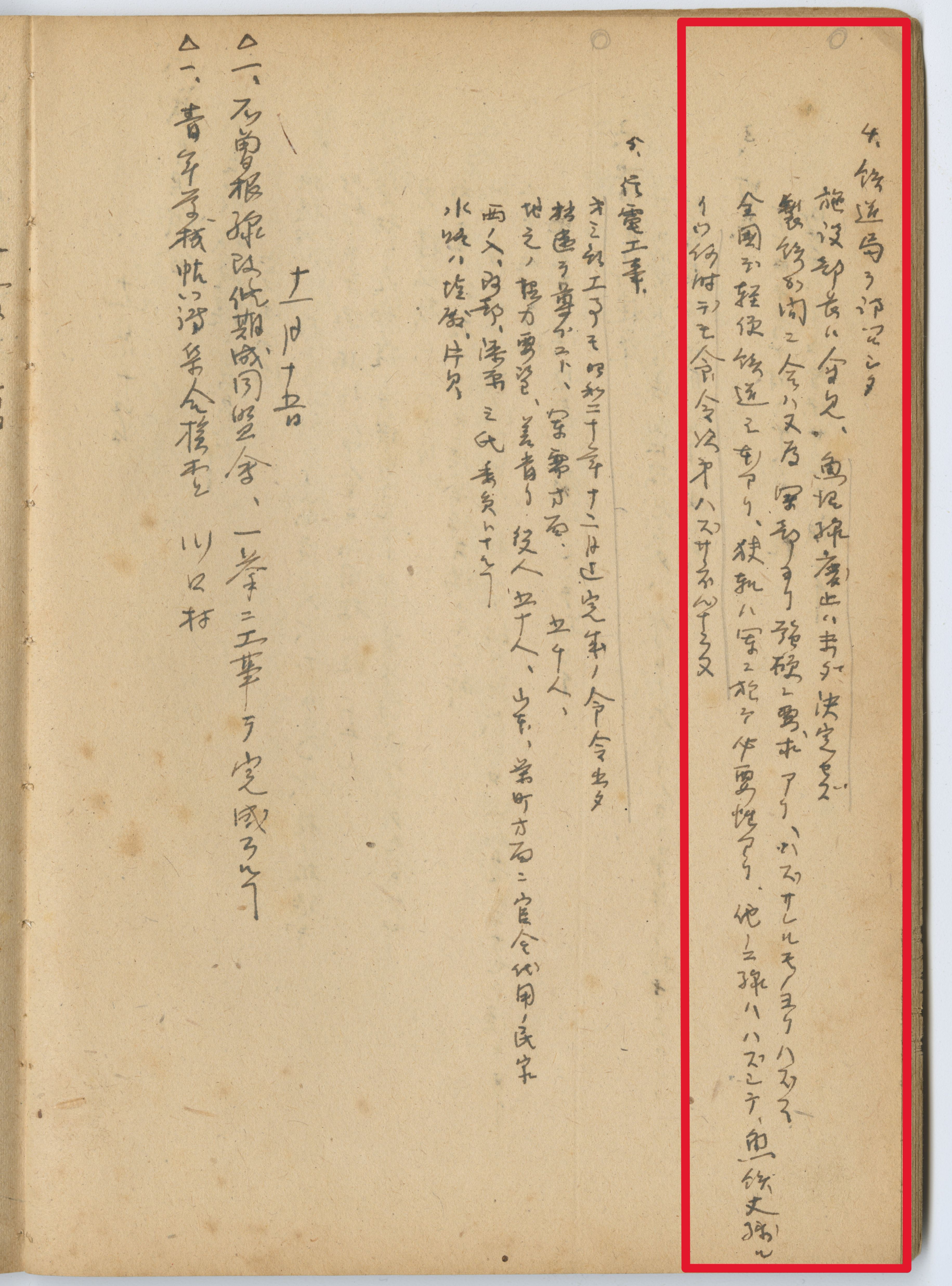 魚沼線は1911年(明治44)に魚沼鉄道として開通した現在の小千谷市域に初めて通った鉄道です。来迎寺~西小千谷を結んでいたこの路線は軽便鉄道と呼ばれる狭い軌道の線路でした。沿線に工兵大隊の駐屯地があったこともあり開業当初は利用者でにぎわっていました。しかし、1920年(大正9)に上越北線の宮内~東小千谷(現小千谷)間が開業したことと工兵大隊の移転の影響で輸送量が激減し、経営が厳しくなりましたが、1922年(大正11)に国に買収され鉄道省魚沼線として営業が続けられました。 太平洋戦争が激化すると国内の資源が不足し、兵器の材料となる金属類が資材として回収されるようになります。『田中積市郎日記』中にも小千谷町が金属回収を行ったことが何回か記述されています。 『田中積市郎日記』昭和18年11月14日にいわゆる赤字路線だった魚沼線について鉄道局と廃止の議論がなされたことが記述されています。この時は「廃止についての結論がでなかった」ことと「(金属不足のため)軍からの要求次第ではいつでも線路をはずす必要がある」ことが書かれています。 結局、魚沼線は1944年(昭和19)に1度目の廃止となりました。はずされた線路は戦争のための資材となりました。