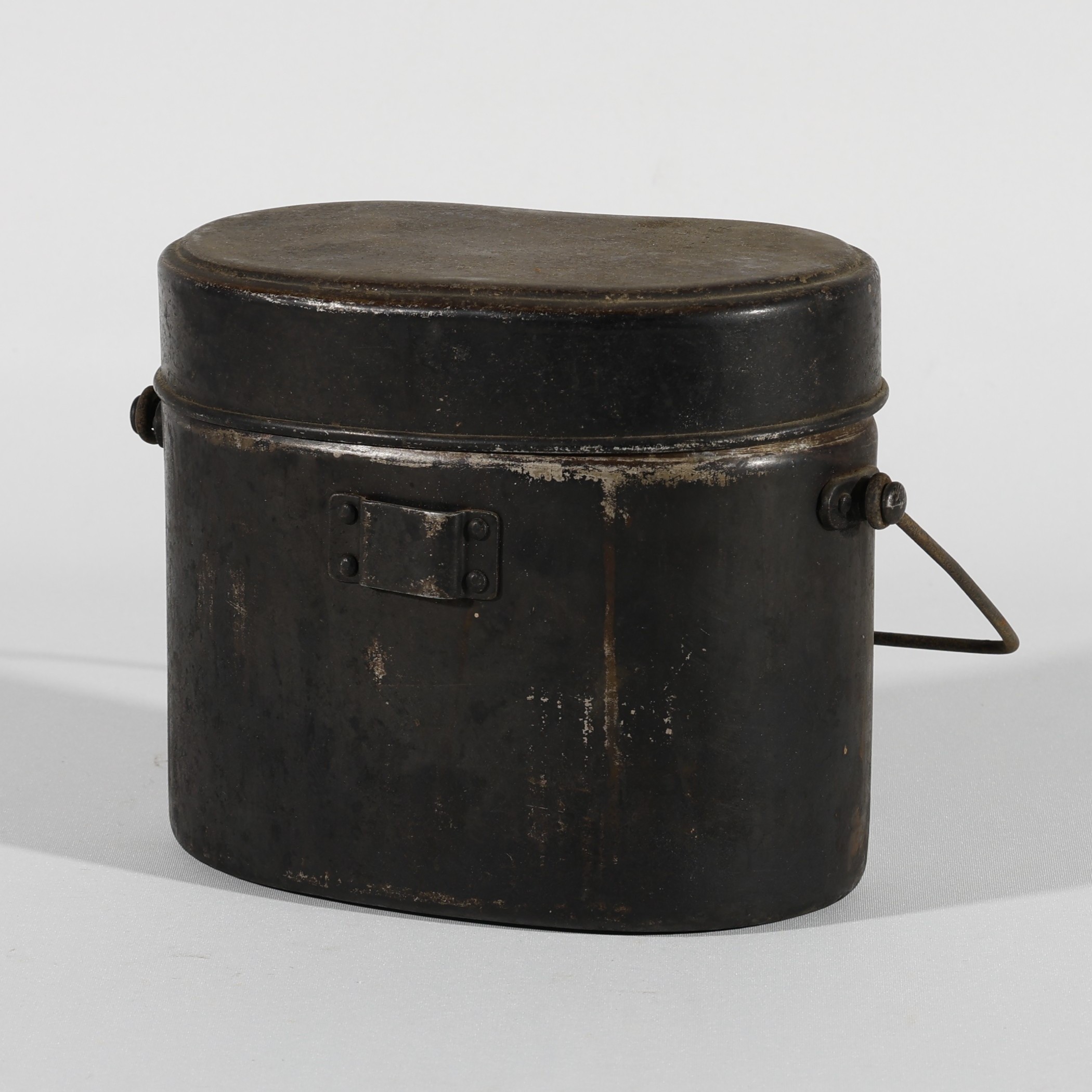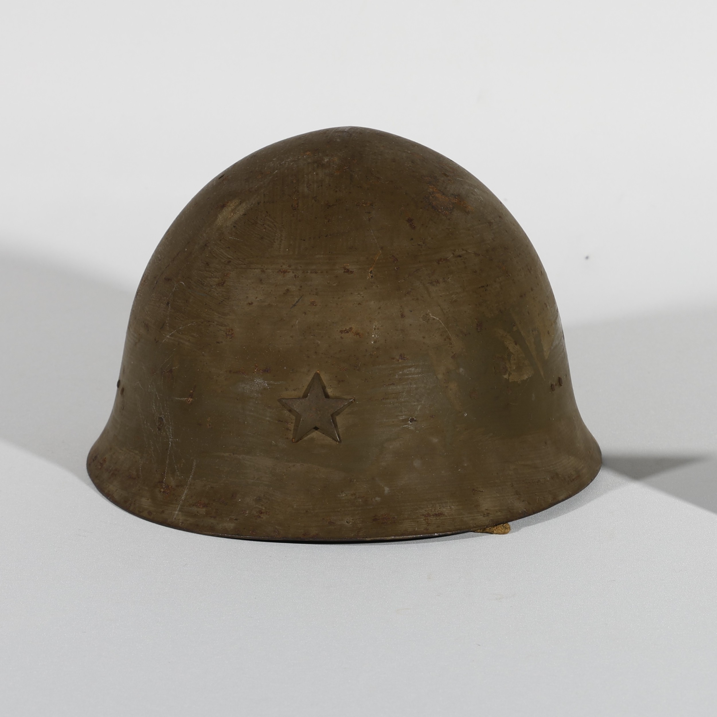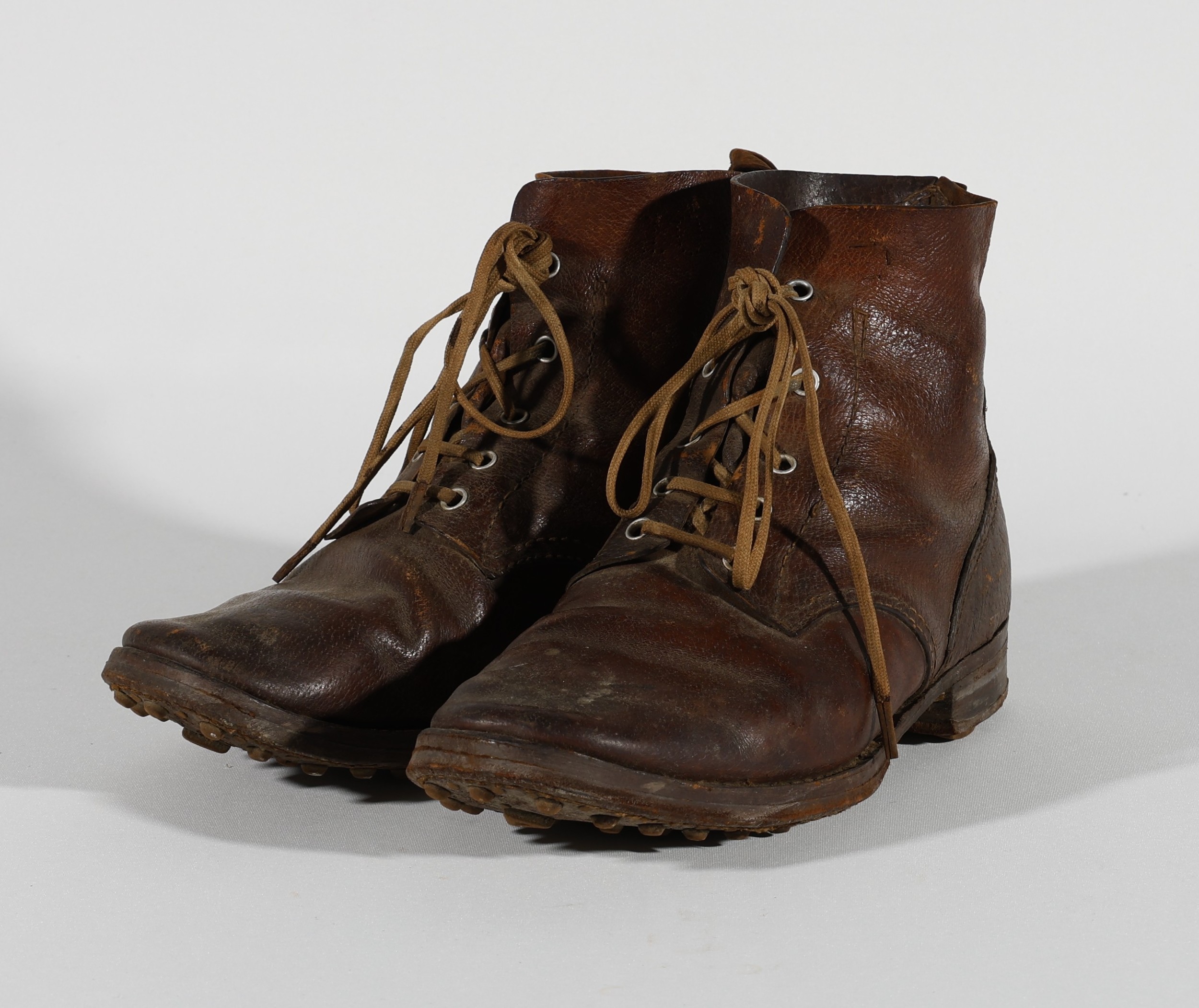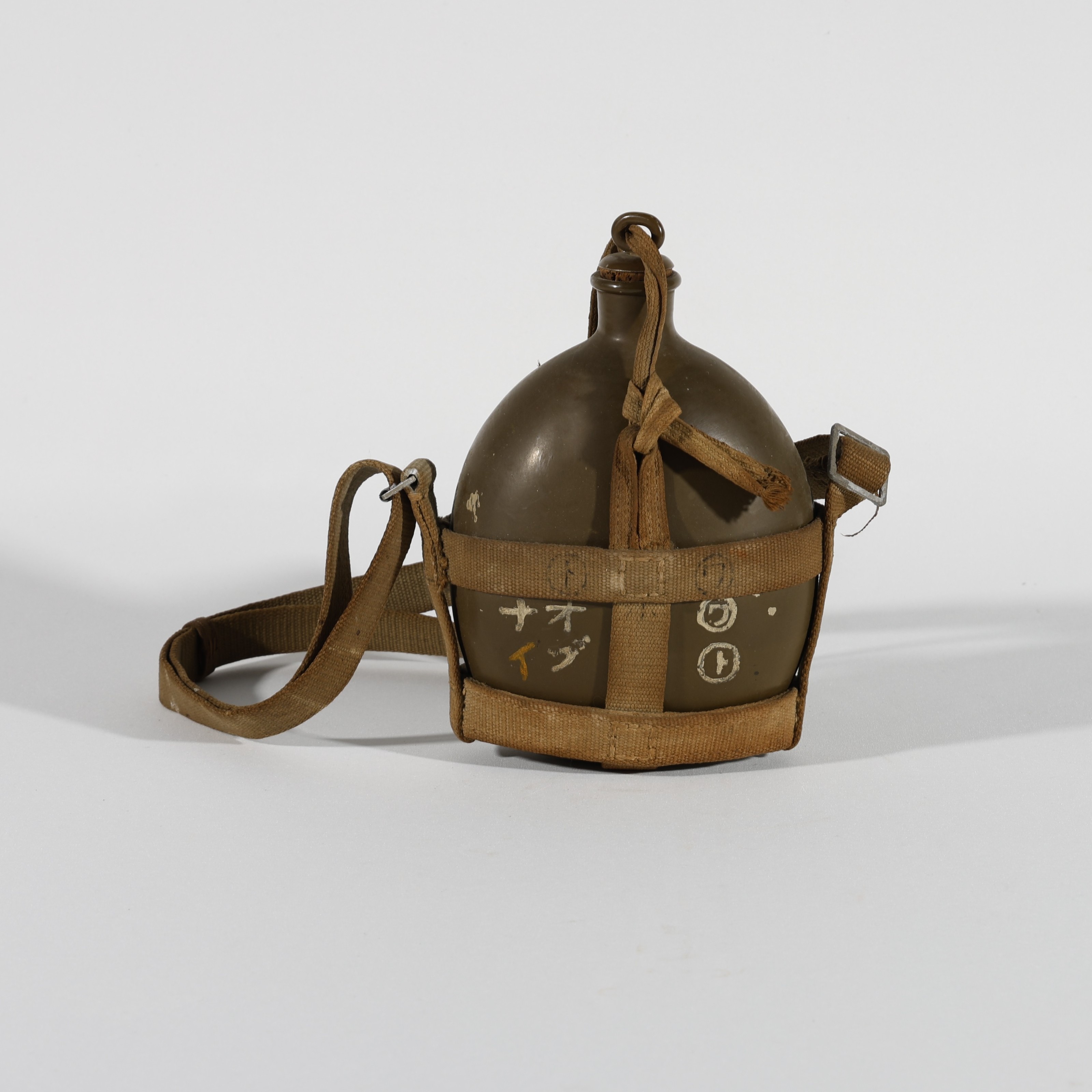 日本陸軍の軍服は明治時代から何回かデザインが変更されています。カーキ色になったのは1904~5年(明治37~38)の日露戦争の最中で、太平洋戦争中に着用されていたえり元で階級を示すデザインになったのは1938年(昭和13)からです。軍服と軍靴、水筒などの装備品は入営するときに軍から支給されました。 写真は1930年(昭和5)頃から使用された「昭五式軍衣」と呼ばれるもので、詰襟であることと肩の部分に階級を示す「縦型肩証」をつけるパーツがあるのが特徴です。身に着けているものは、略帽と雑嚢(カバン)です。