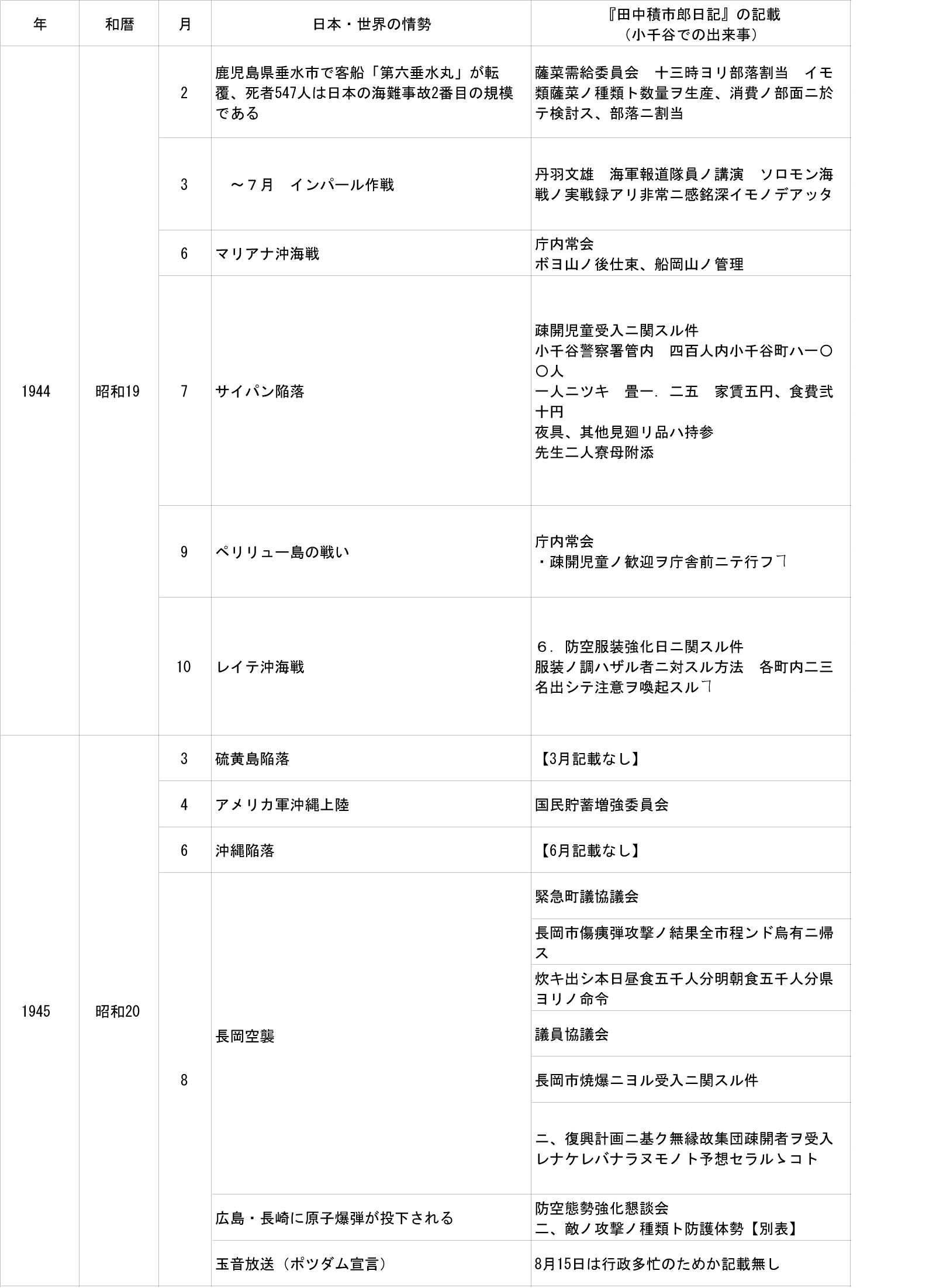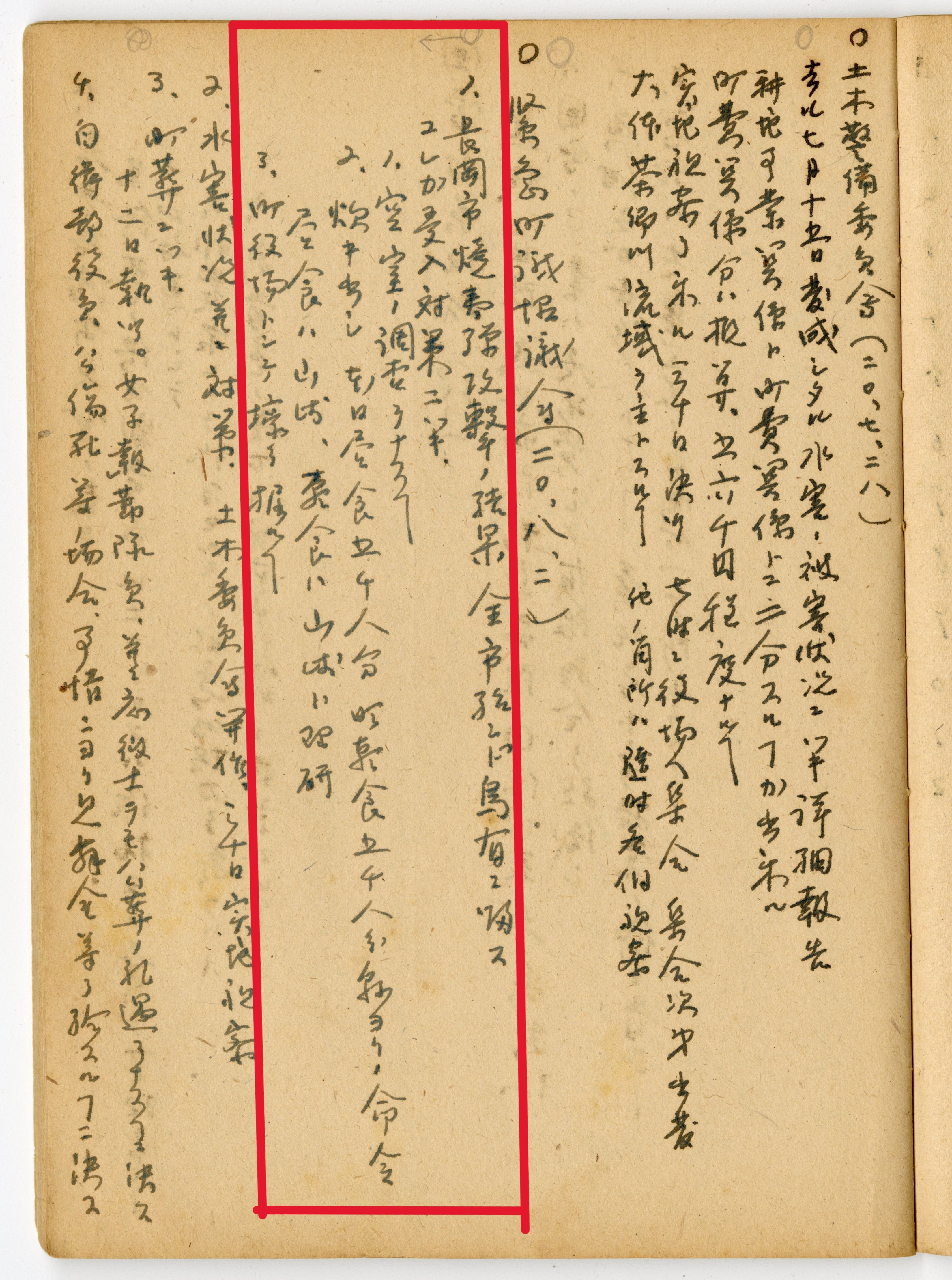 「長岡市傷痍弾攻撃ノ結果全市程ンド烏有ニ帰ス」と『田中積市郎日記』8月2日に記述があるように、長岡の被害状況はすぐに伝わっていました。町としても近くで起きた大規模な空襲への対応をすることとなりますが、空襲で長岡市長も犠牲になっていたため、長岡市と小千谷町とで直接の連携体制に難儀があったことは想像に難くありません。 長岡空襲では約6万人の人々が帰る家を失ったといわれています。小千谷町では8月2日の段階で町内の空室の調査を進め、被災者の受け入れについても早々に準備したこと、新潟県からは2日の昼食と3日の朝食それぞれ5000人分の炊き出しを用意することが命令されたことがわかります。