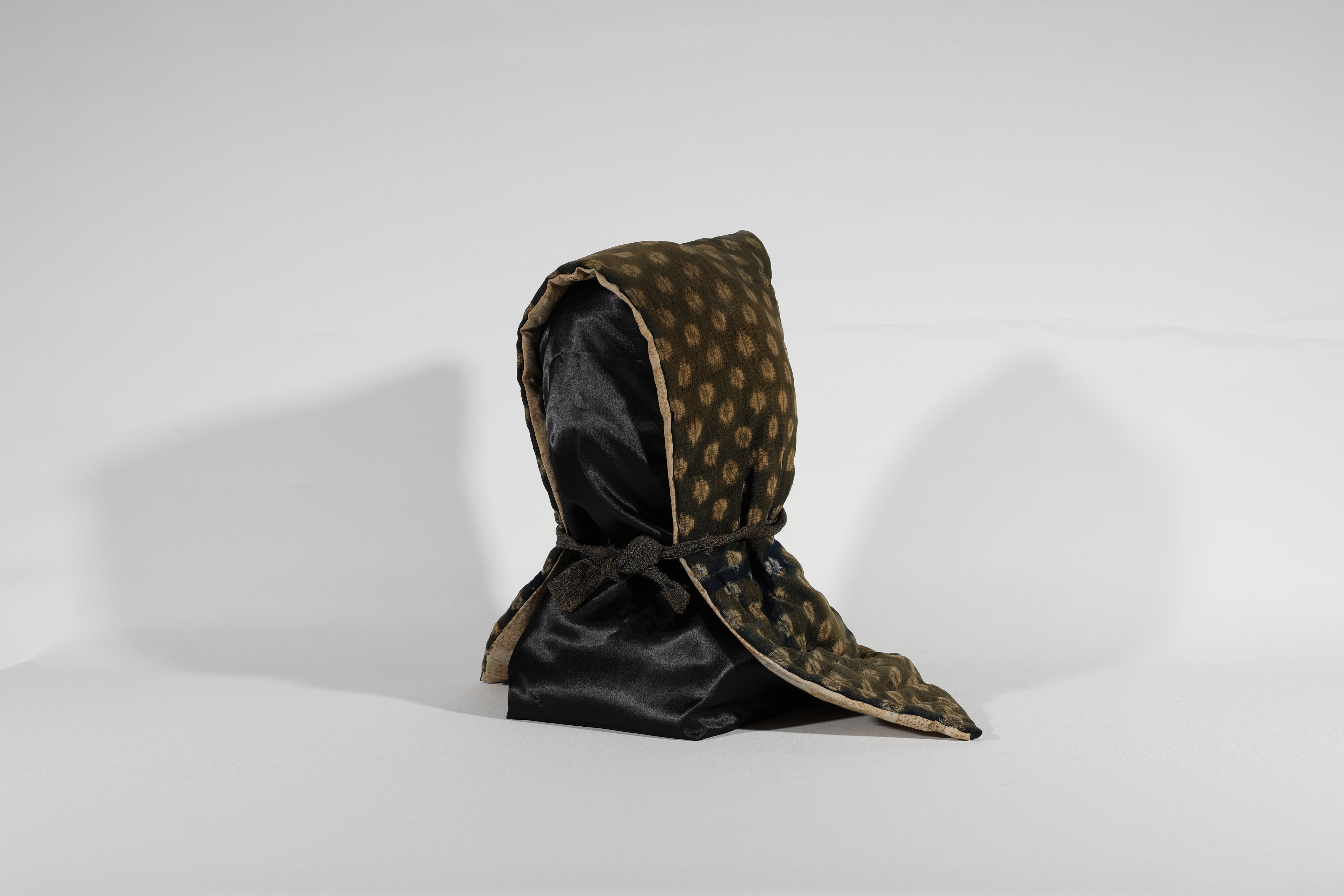 空襲のときに爆風や火事などから顔や頭をまもるためにかぶるもので、学校や買い物に行くときなどにも持ち歩いていました。布と綿でできているので燃えやすく、水でぬらしてから使うこともありました。