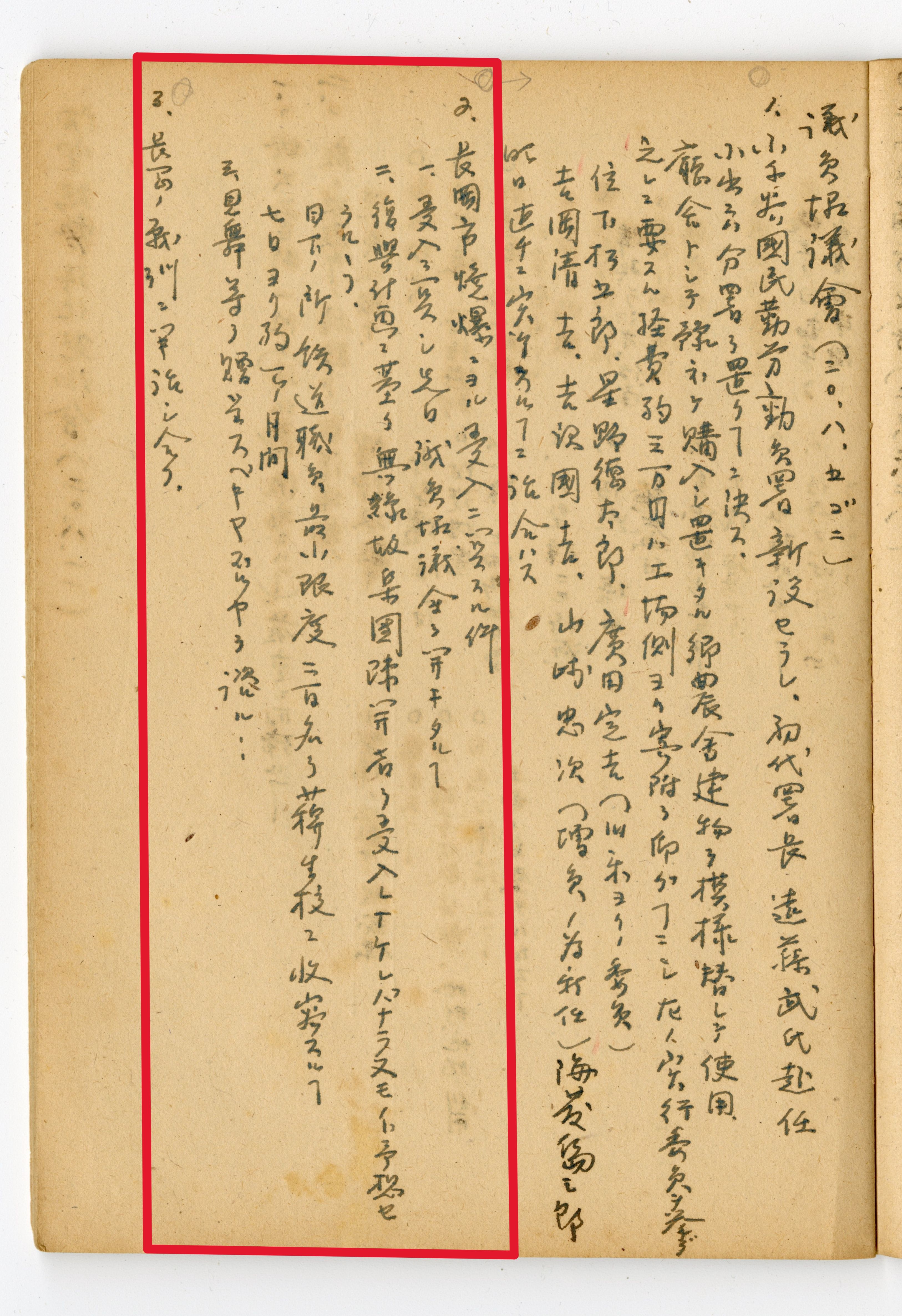 長岡空襲の翌日に緊急町議会を開き、被災者の受け入れと対策について協議したことが記録されています。