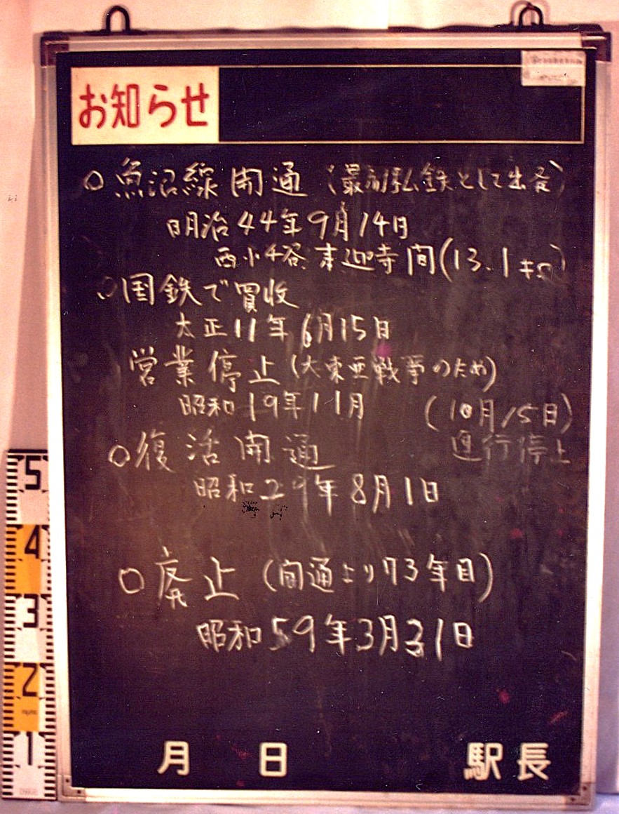 この掲示板は、かつて小千谷市内を走っていた国鉄魚沼線が1984年(昭和59)に廃止されたときに書かれたものです。実はこの時は2度目の廃止で、1度目の廃止は「営業停止(大東亜戦争のため)」とあるように、太平洋戦争期にさかのぼります。