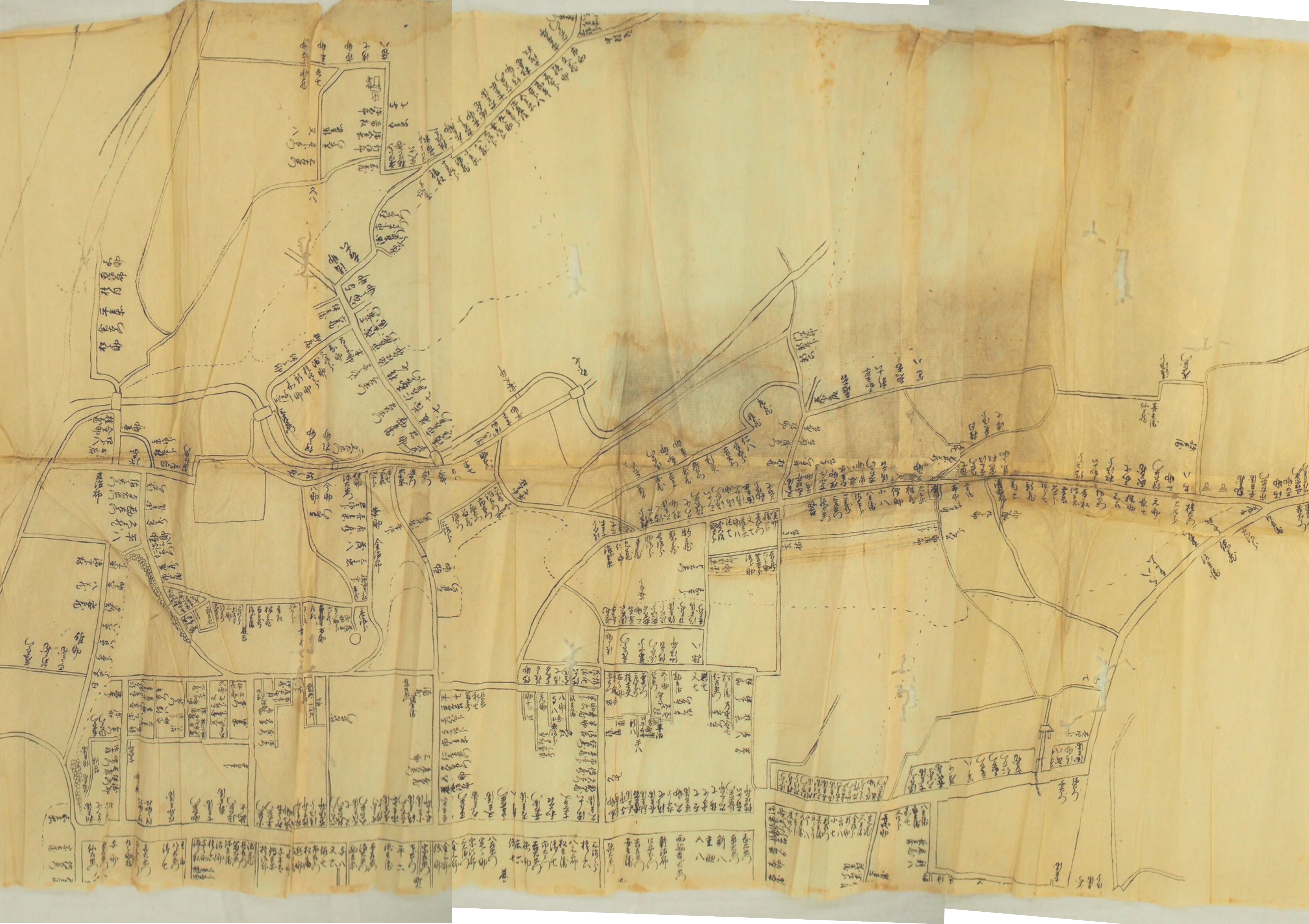 【小千谷陣屋_小千谷村耕地図】 1862年、江戸幕府(会津藩)へ統治状況を報告するために描いた絵図 見どころ : 主要な道や、寺社の配置状況、区画面積が詳細に描かれている。 読み取りにくいこと : 道のつくり、工作物