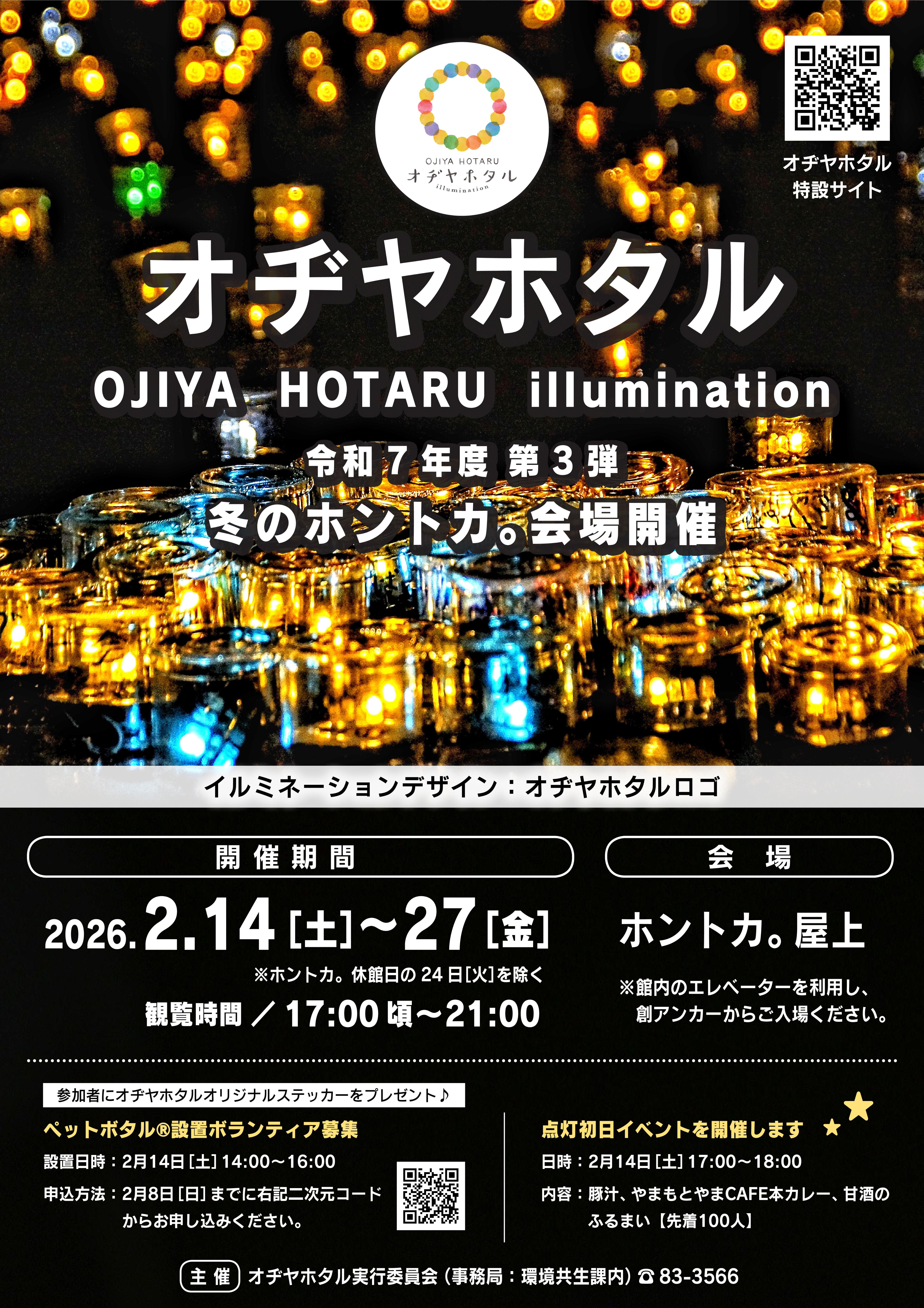令和7年度第3弾! 冬のホントカ。ルーフ(屋上)を会場に開催します! ■設置イベント開催 点灯初日に設置イベントを開催します。 ・日時/2月14日(土)17:00~18:00 ・会場/ホントカ。ルーフ(屋上) ・内容/豚汁、やまもとやまCAFE本カレー、甘酒のふるまい(先着100人) ■設置ボランティア募集 ペットボタルⓇ設置ボランティアを募集します。 ご協力いただいた方に、豚汁とオヂヤホタルオリジナルステッカーをプレゼント! 詳細は以下のちらしをご確認ください。