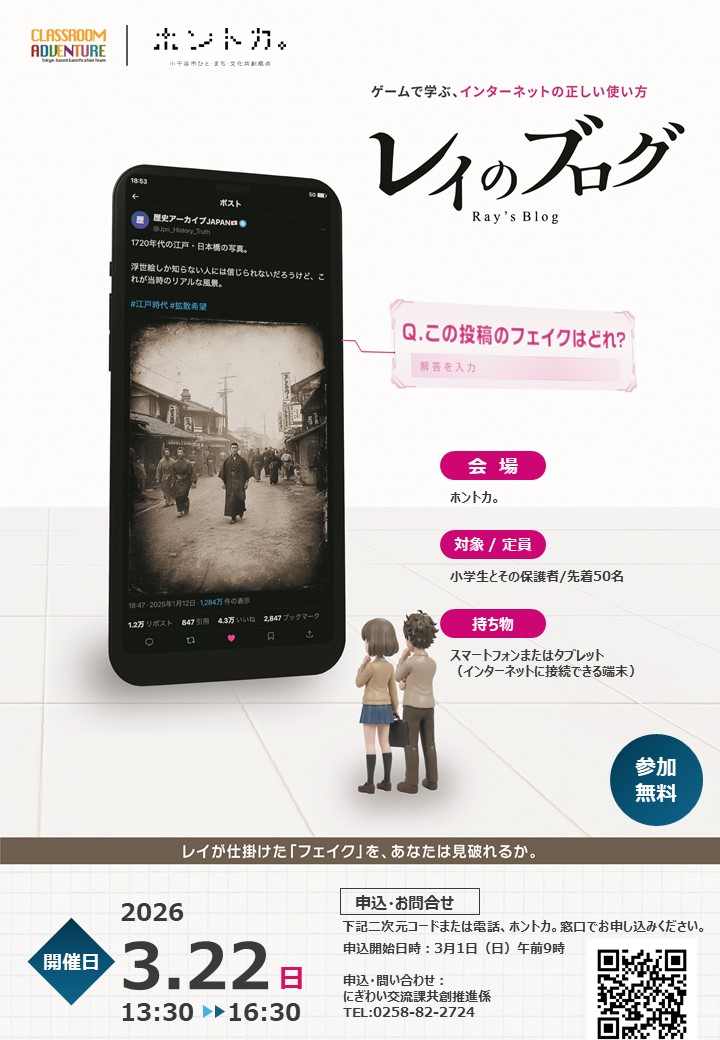 検索型謎解きゲーム「レイのブログ」を通して、楽しみながら情報リテラシー・メディアリテラシーを身につけられるイベントです。 対象:小学生とその保護者 定員:先着50名 持ち物:スマートフォンまたはタブレット(インターネットに接続できる端末)