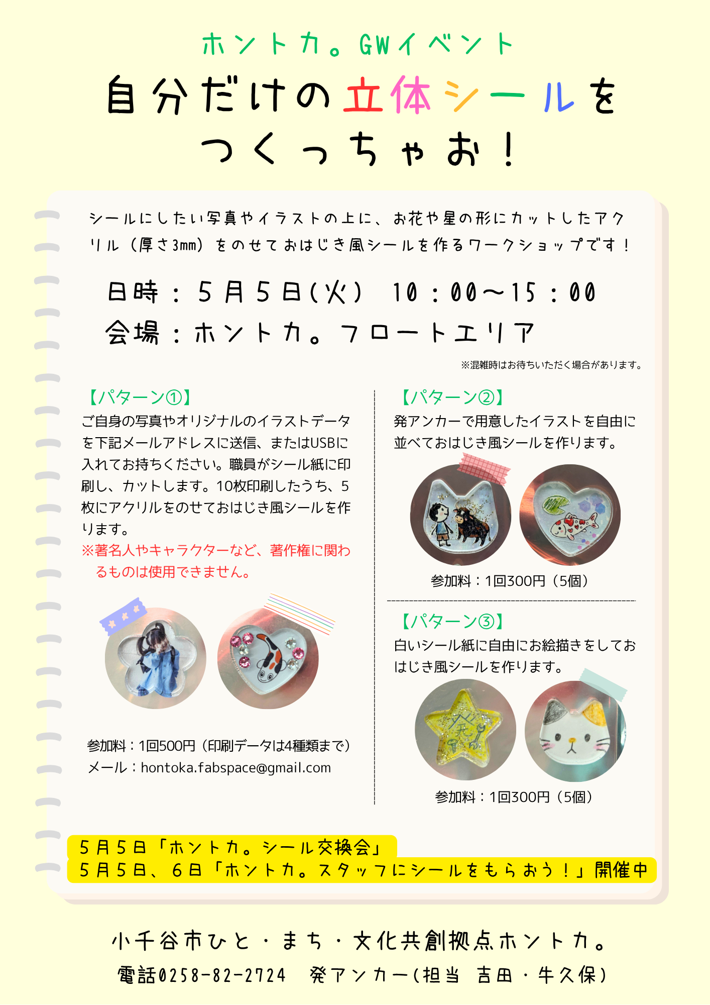 シールにしたい写真やイラストの上に、お花や星の形にカットしたアクリル(厚さ3㎜)をのせておはじき風シールを作るワークショップです。 【パターン①】 ご自身の写真やオリジナルのイラストデータを下記メールアドレスに送信、またはUSBに入れてお持ちください。職員がシール紙に印刷し、カットします。10枚印刷したうち、5枚にアクリルをのせておはじき風シールを作ります。 ※著名人やキャラクターなど、著作権に関わるものは使用できません。 参加料:1回500円(印刷データは4種類まで) メール :hontoka.fabspace@gmail.com 当日参加も可能ですが、できるだけ5月4日までにデータをお送りください。 【パターン②】 発アンカーで用意したイラストを自由に並べます。上からアクリルをのせておはじき風シールを作ります。 参加料:1回300円(5個) 【パターン③】 アクリルと同じ形に切ったシール紙に、自由にお絵描きをします。上からアクリルをのせておはじき風シールを作ります。 参加料:1回300円(5個) ※混雑時はお待ちいただく場合があります。