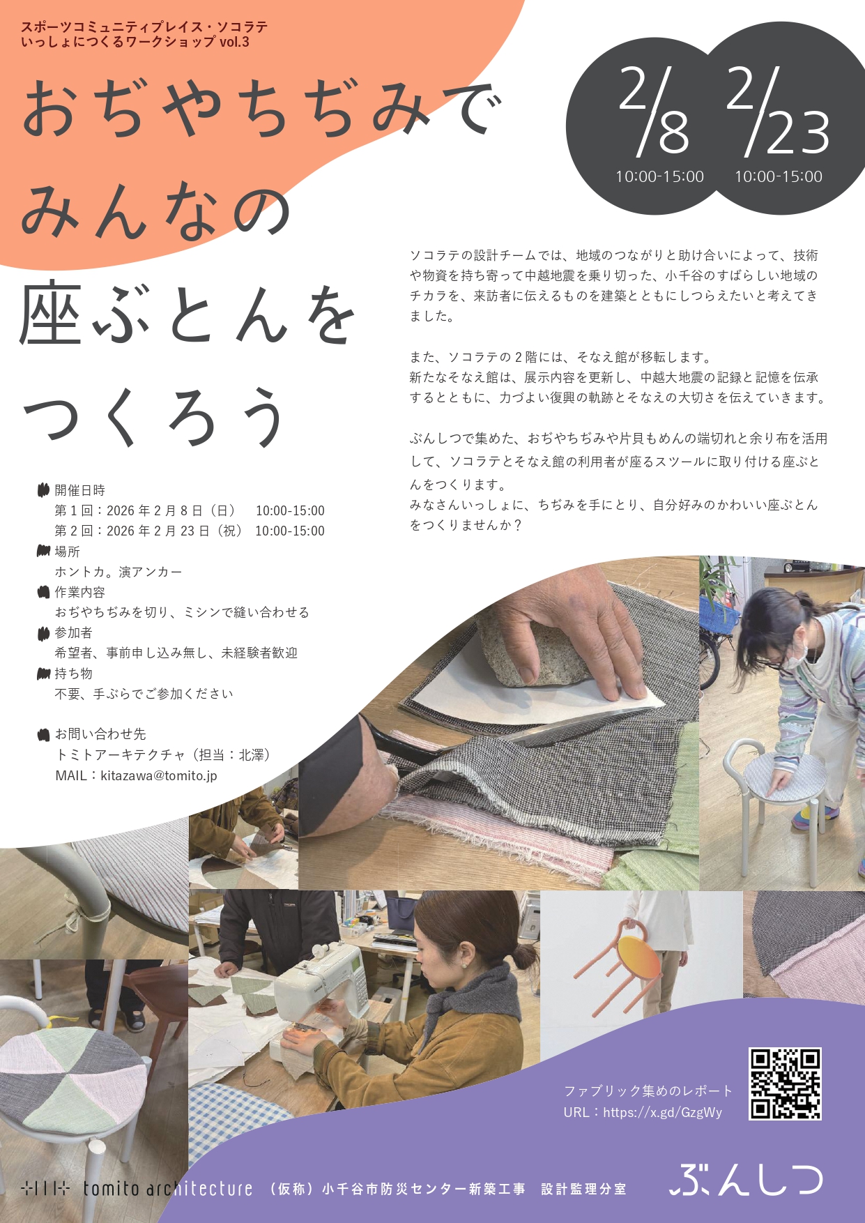ソコラテの設計チームでは、地域のつながりと助け合いによって、技術や物資を持ち寄って中越大震災を乗り切った、小千谷のすばらしい地域のチカラを、来訪者に伝えるものを建築とともにしつらえたいと考えてきました。 また、ソコラテの2階には、そなえ館が移転します。 新たなそなえ館は、展示内容を更新し、中越大震災の記録と記憶を伝承するとともに、力づよい復興の軌跡とそなえの大切さを伝えていきます。 ぶんしつで集めた、おぢやちぢみや片貝もめんの端切れと余り布を活用して、ソコラテとそなえ館の利用者が座るスツールに取り付ける座ぶとんをつくります。 みなさんいっしょに、ちぢみを手にとり、自分好みのかわいい座ぶとんをつくりませんか?