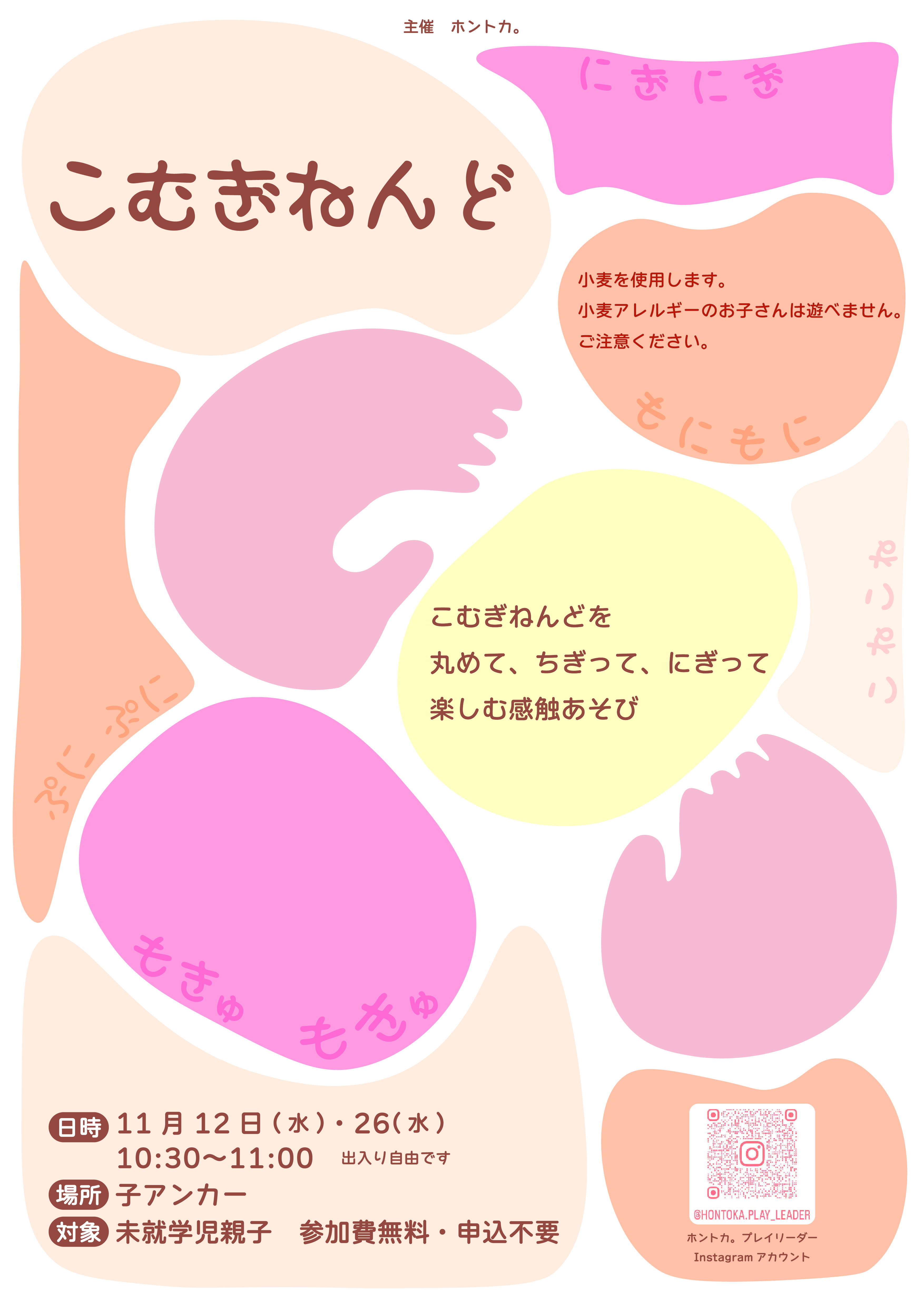 こむぎねんどを丸めて、ちぎって、にぎって楽しむ感覚遊び 注意:小麦を使用します。小麦アレルギーのお子さんは遊べません。