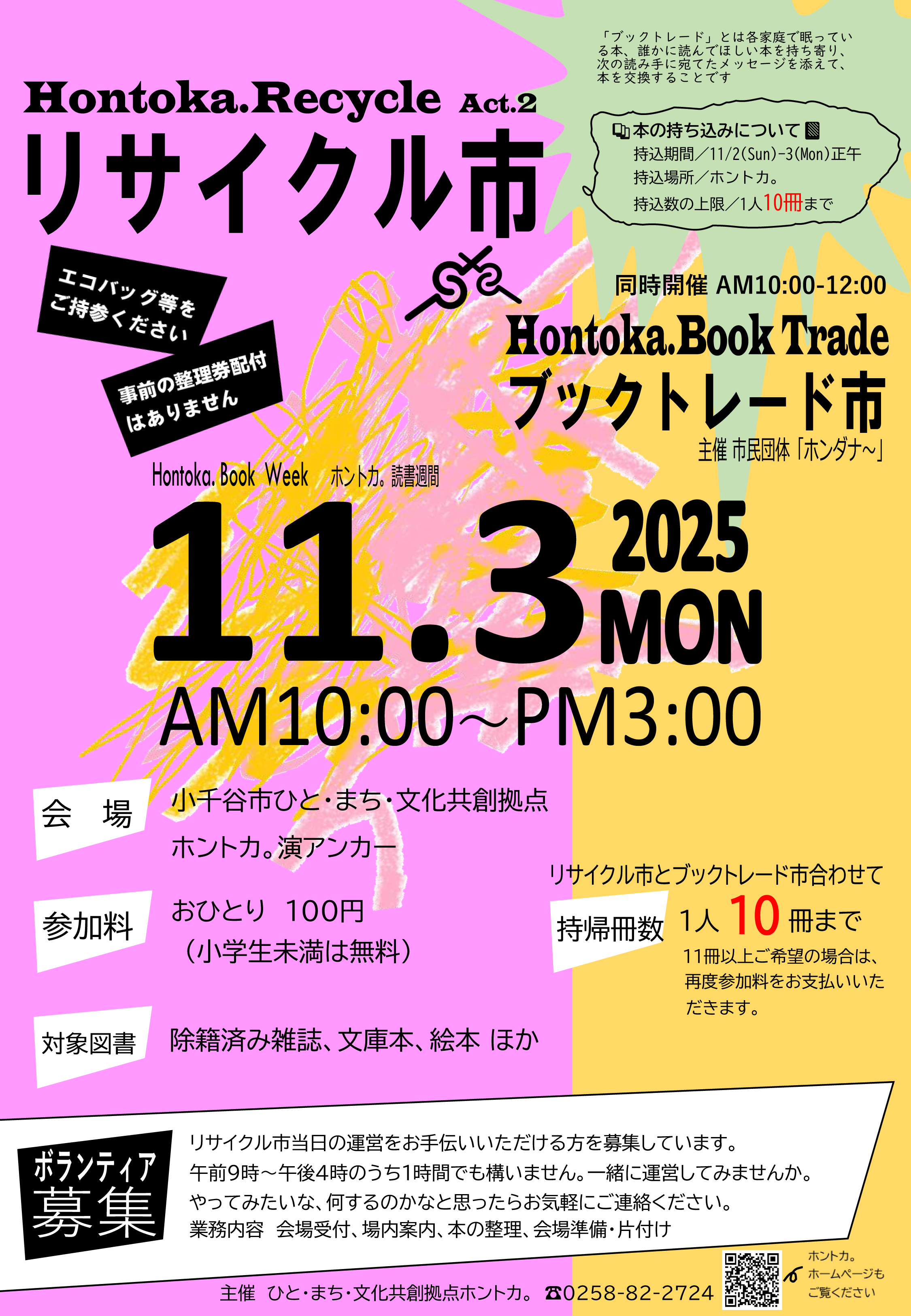 ホントカ。リサイクル市vol.2とホントカ。ブックトレード市を同時開催します。 ■ホントカ。リサイクル市vol.2 保存期間の過ぎた雑誌や除籍済みの図書などの有効利用と図書館利用者の拡大を目的として「ホントカ。リサイクル市」を開催します。 ※持ち帰り用にエコバッグなどをご持参ください。 ※事前の整理券の配付は行いません。 ※お持ち帰りいただける冊数は、リサイクル本とブックトレード本を合わせて10冊までです。 (11冊以上をご希望の方は、追加の参加料をお払いただきます) ■ホントカ。ブックトレード市(主催/市民団体「ホンダナ~」) ブックトレードとは、各家庭で眠っている本、誰かに読んでほしい本を持ち寄り、 次の読み手に宛てたメッセージを添えて、本を交換することです。 1)対象図書について 持込可/雑誌、マンガ、文庫本、絵本、写真集、百科事典、辞書 持込不可/自費出版の本、汚れや破れのある本、新聞、教科書、参考図書等の教育用材、赤本、図書館譲渡本、成年向け(18 禁)書籍全般、パンフレット 2)本の持ち込みについて ・持込期間/11月2日(日)午前9時~午後10時 11月3日(月・祝)午前9時~正午 ・持込数等の制限/1人10冊まで 3)メッセージの記入 ・本を持ち込んだ際にメッセージカードにご記入いただきます。 本1冊ごと、全体ひとくくりでもOKです。 4)その他 原則、残本は持ち込みいただいた方にお持ち帰りいただきます。 【運営ボランティアを募集しています 問合せ先/0258-82-2724】 ・リサイクル市当日の運営をお手伝いいただける方を募集しています。 ・午前9時~午後5時のうち1時間でも構いません。 ・会場受付、場内案内、本の整理、会場準備・片づけ等一緒に運営してみませんか。 ・やってみたいな、短時間だけどチャレンジしてみたいなと思ったらお気軽にご連絡ください。