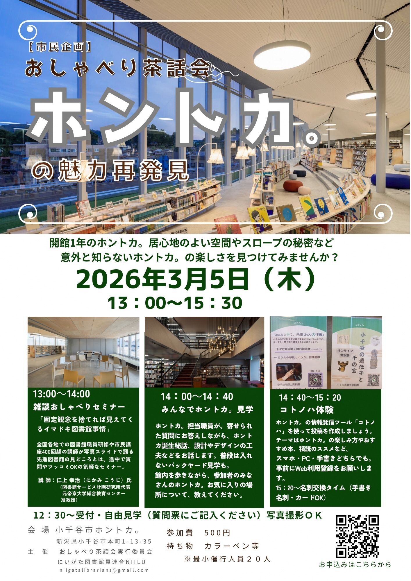 主催/おしゃべり茶話会実行委員会、にいがた図書館員連合NIILU 12:30- 【受付、自由見学(質問票にご記入ください)】 ※写真撮影OK 13:00-14:00 【雑談おしゃべりセミナー】 「固定観念を捨てれば見えてくるイマドキ図書館事情」 全国各地での図書館職員研修や市民講座400回超の講師が写真スライドで語る先進図書館の見どころとは。 途中で質問や突っ込みOKの気軽なセミナー 【講師】 仁上 幸治(にかみ こうじ)氏 図書館サービス計画研究所代表、元帝京大学総合教育センター准教授 14:00-14:40 【みんなでホントカ。見学】 ホントカ。担当職員が、寄せられた質問にお答えしながら、ホントカ。誕生秘話、設計やデザインの工夫などをお話しします。普段は入れないバックヤード見学も。館内を歩きながら、参加者のみなさんの、ホントカ。お気に入りの場所についても教えてください。 14:40-15:20 【コトノハ体験】 ホントカ。の情報発信ツール「コトノハ」を使って投稿を作成しましょう。 テーマはホントカ。の楽しみ方やおすすめ本、積読のススメなど。 スマホ・PC・手書きどちらでも。事前にweb利用登録をお願いします。 15:20- 【名刺交換タイム(手書き名刺、カードOK)】