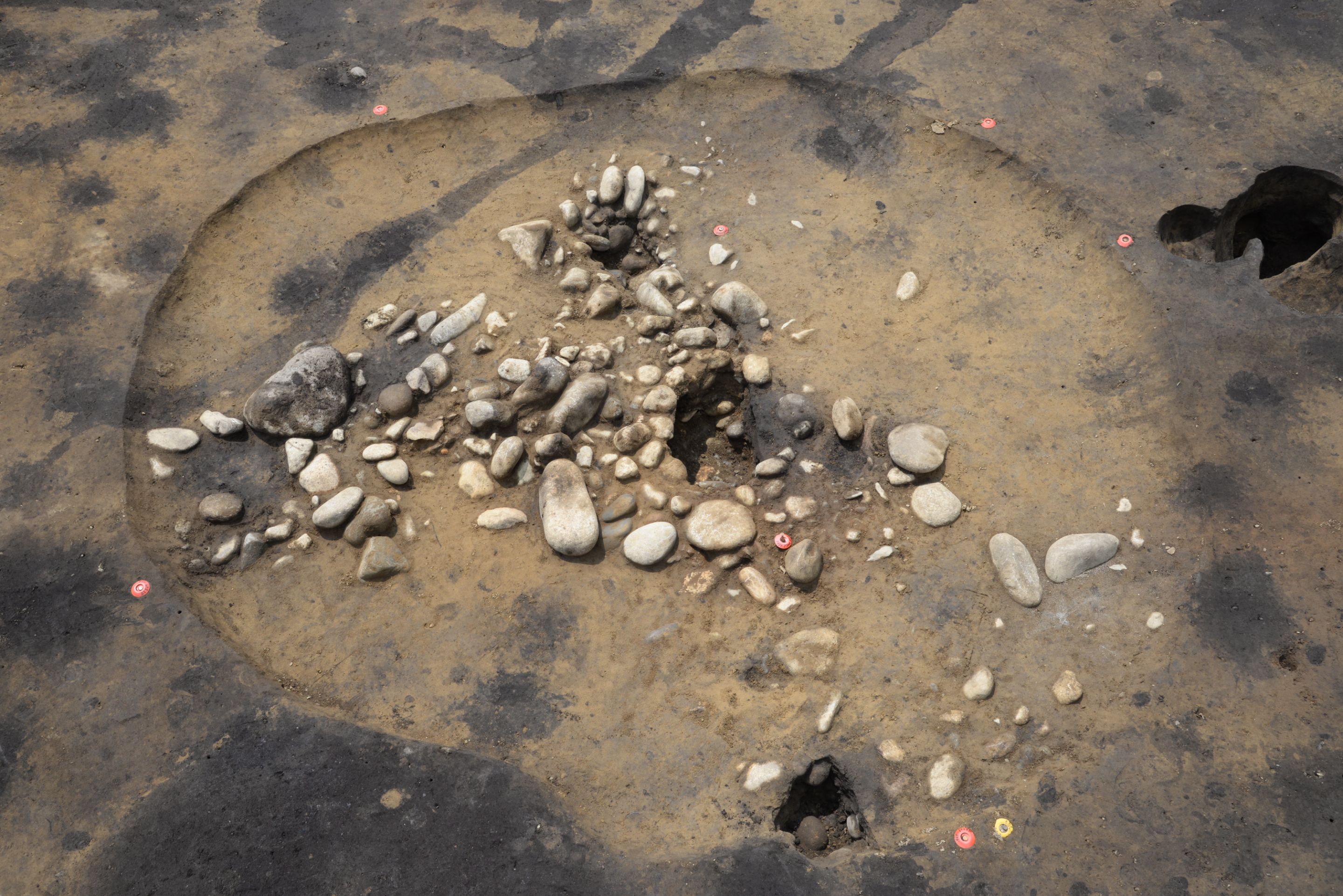 一方でこちらの住居は、住居の大半で石を敷いていることがわかります。石の種類も大小様々で、床全体に凹凸を感じます。また、住居の中心部の石は焼けている跡を見ることができます。形状だけでは、どのように使われた竪穴住居かは、想像できませんが、4点ある大きな石に、「石をぶつけた痕」が認められることから、住居の中で石器などの道具を製作していたと推定できます。
