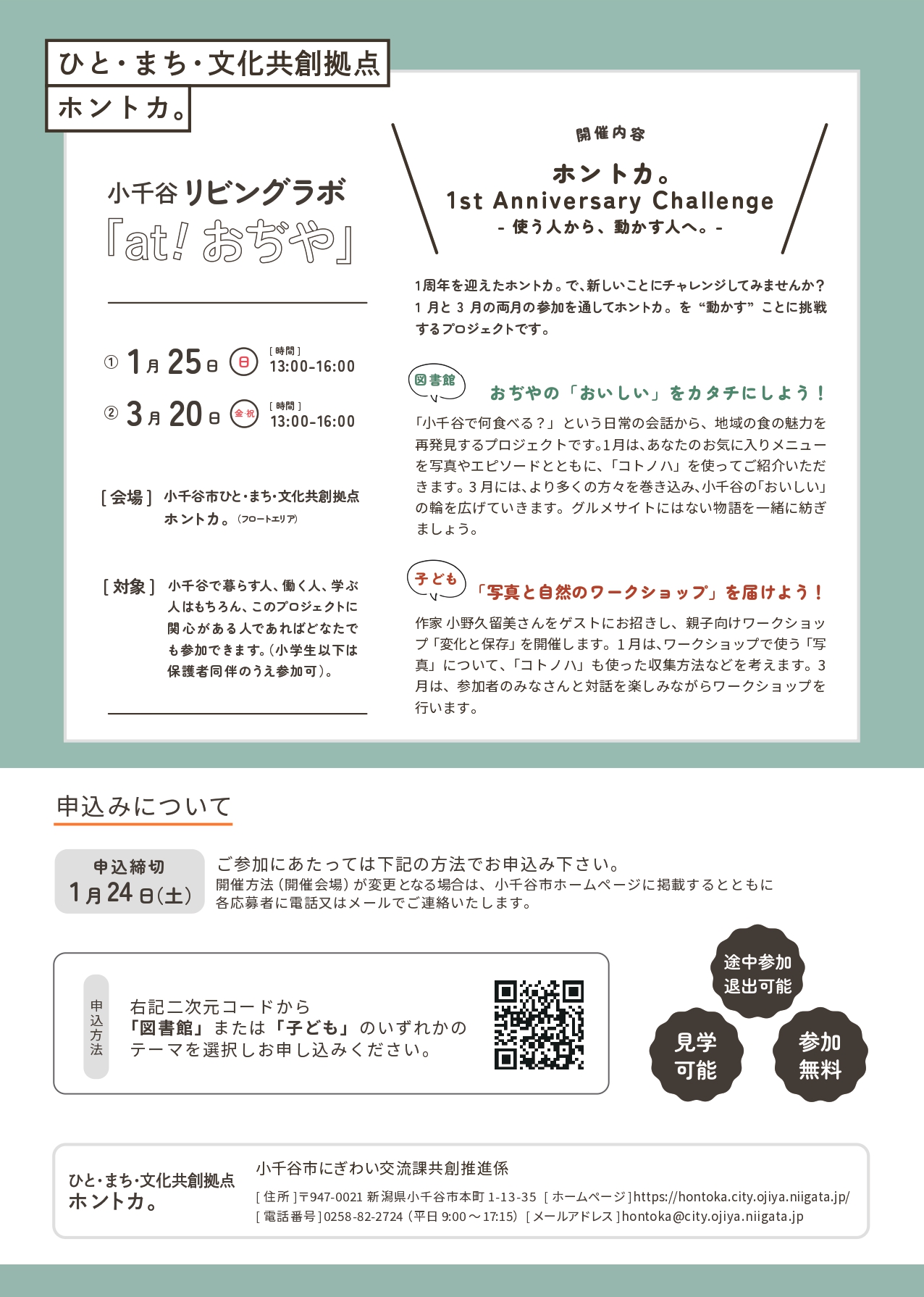 ホントカ。の館内を歩いていて、 二次元コードの貼られたカードを見たことはありませんか。 このカードこそが「コトノハ」! 「コトノハ」は、 小千谷市に関わる誰かが伝えてくれる 物語・情報 への扉です。 ・個性的なテーマでまとめられたブックリスト ・日々の活動記録 ・企画中のイベント など この「コトノハ」は誰でも自由に作ることができます。 ======== 「コトノハ」が気になるという方は、 「図書館」のテーマで、じっくりコトノハに触れることができます!! 小千谷の「食」を、あなただけの文章と写真を使って、グルメサイトにはない物語をコトノハで紹介しませんか? ・コトノハについてわからない方 ・コトノハを作ったことのない方 教えてもらいながら、始めてみましょう!