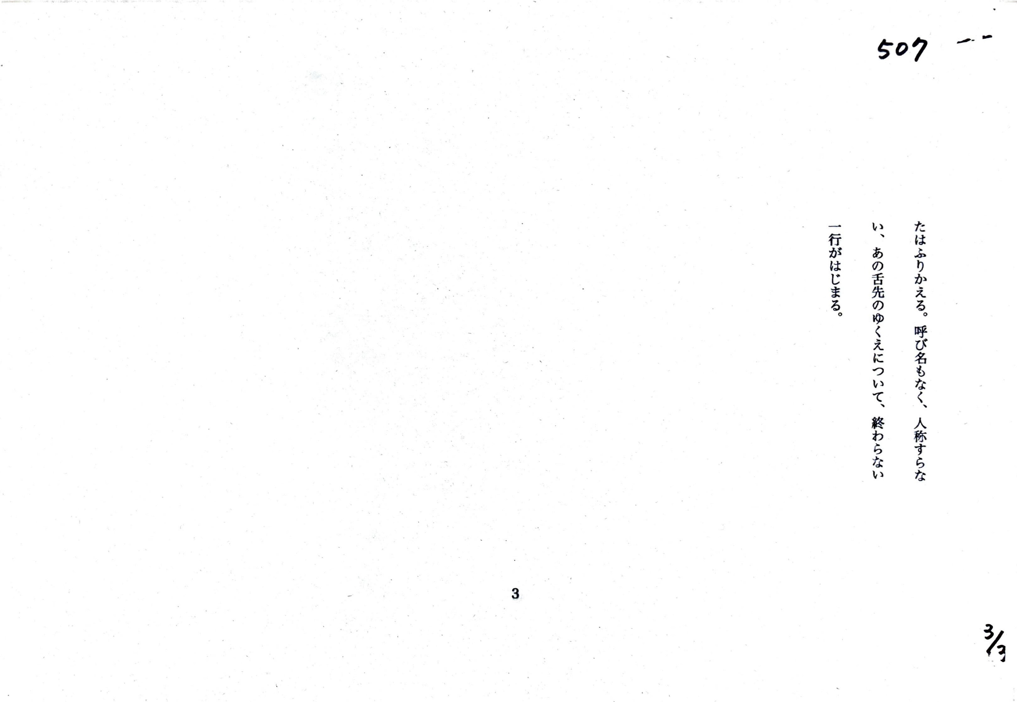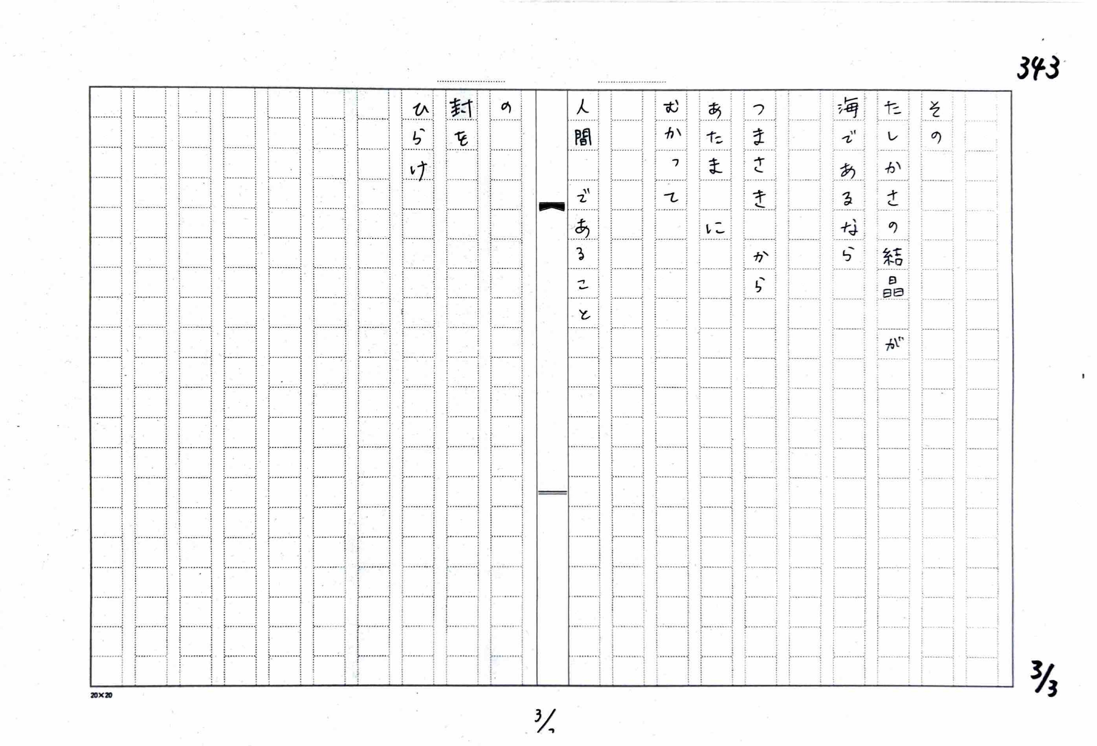 - 詩はわたしが書くのではないという気がしています。わたしという存在を含めた環境から生じるその一行にいかに耳を立てていられるか。茄子のふくらみに白く写るものにいかに眼を光らせていられるか。書くということにわたしを献身し尽くせるか。もう誤魔化せないという思いです。選考委員の皆様、関係者の皆様、偉大なる西脇順三郎様、これまで一瞬でも出逢うことのあったすべての人や物たち、そしてとりわけ愛しいひとりの幽霊に感謝申し上げます。