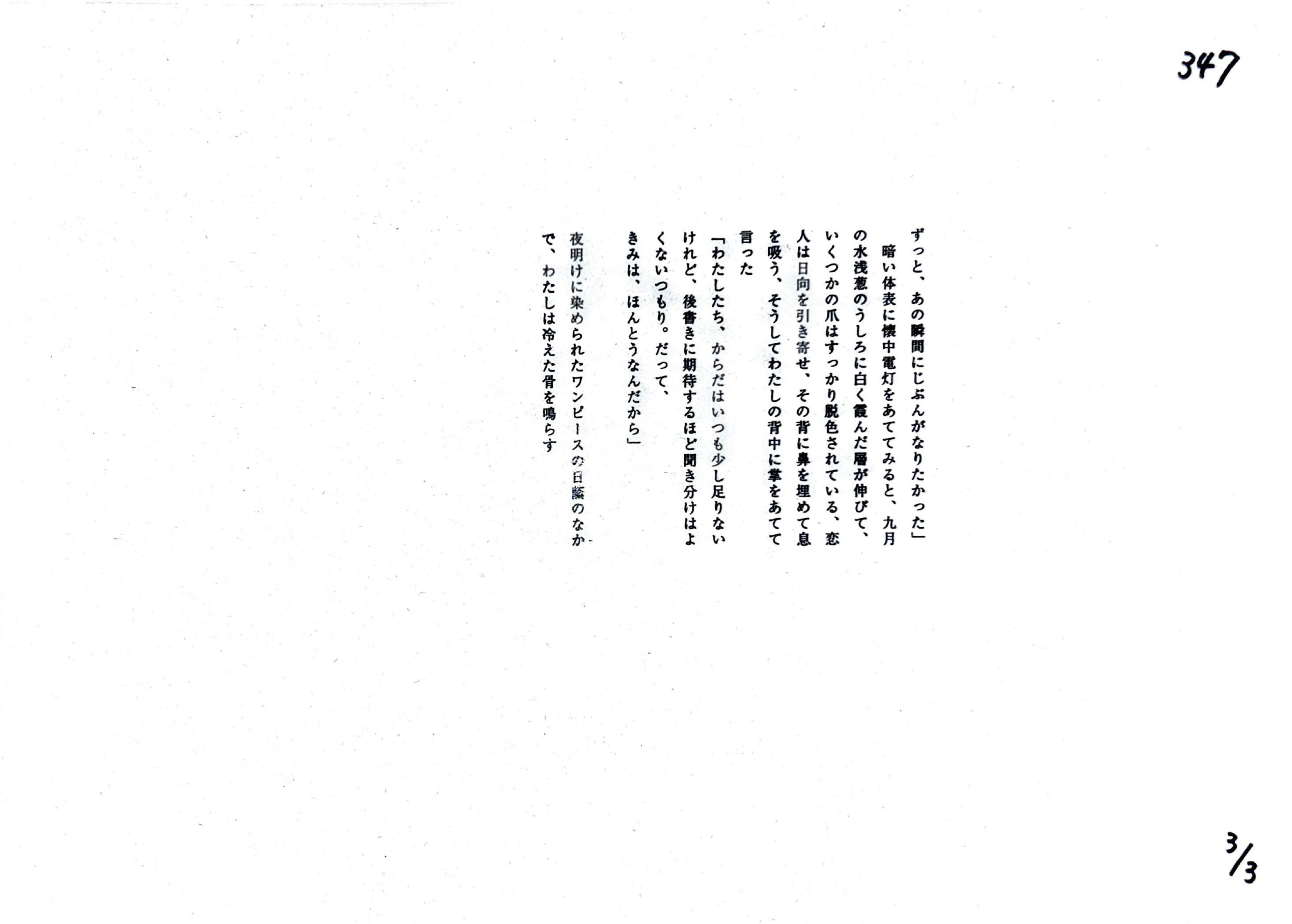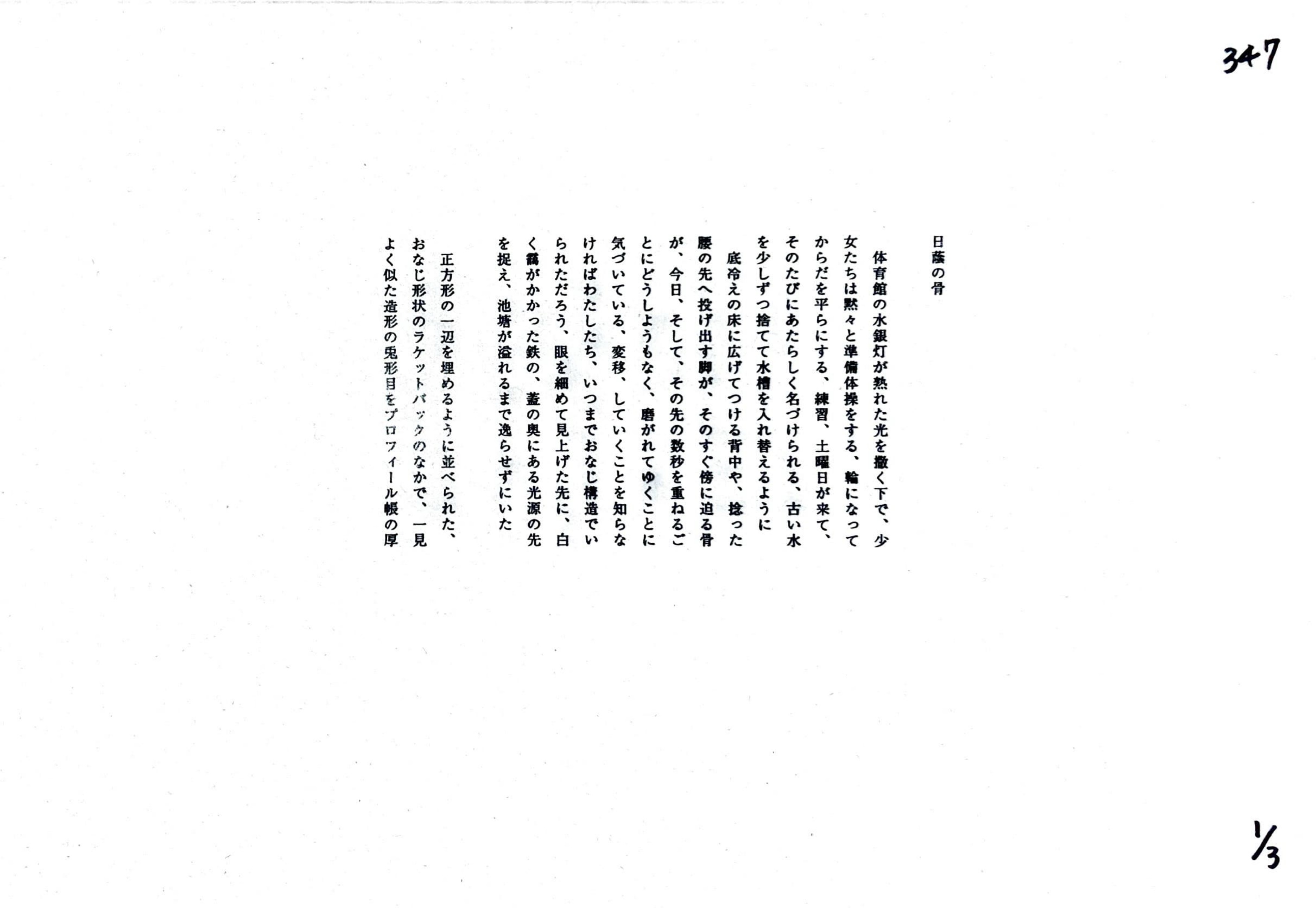 - ひとときの自分を通りすぎていくことばを、詩によって保存された景色を取り出して眺めてみたときに、思い出すことができたらしい、とよく考えています。それが喜びであれ、悲しみであれ、励ましであれ、憎しみであれ、どんなものであったとしても、詩のなかでは生身で、それはとても怖くもあるし、とても自然なことのようにも思えます。そういった意味で、「日蔭の骨」はとても大切な詩です。選んでいただきありがとうございます。